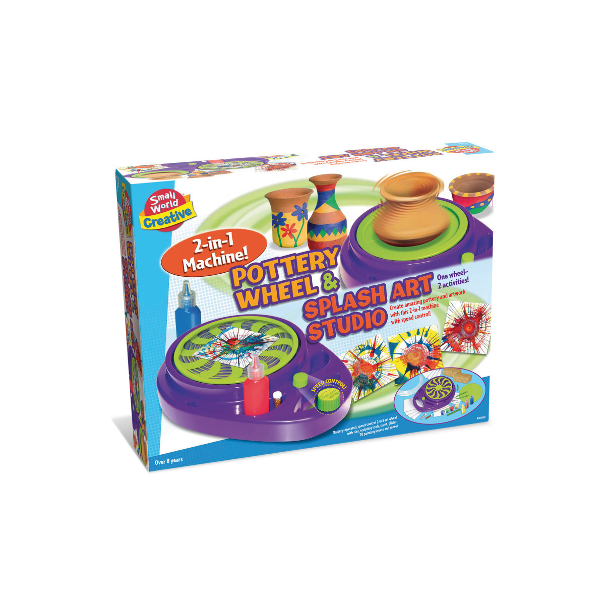 Unleash your creativity with the Pottery Wheel & Splash Art Studio, a versatile 2-in-1 craft set perfect for kids ages 8 and up. This innovative machine lets children sculpt amazing pottery and create vibrant splash art with the same easy-to-use setup. The battery-operated revolving machine features an on/off switch and speed control, and the interchangeable trays allow for seamless transitions between clay and paint projects. The kit includes 2 lbs. of clay, 3 bottles of paint, 4 paint pots, sculpting tools, glitter, paintbrush, and 20 assorted papers, providing all the supplies needed for endless artistic possibilities. With detailed instructions included, the Pottery Wheel & Splash Art Studio encourages fine motor skills, imaginative expression, and hours of creative fun.