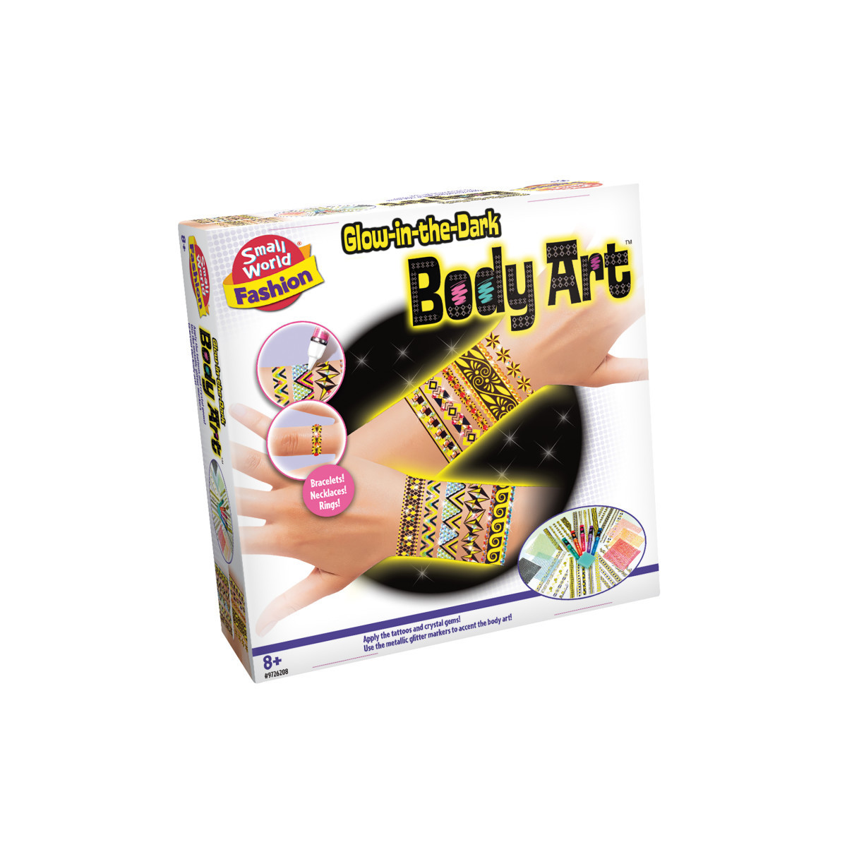 Illuminate your style with the Glow In The Dark Body Art Kit, a fun and creative DIY set for kids ages 8 and up. This kit allows children to apply glowing tattoos and sparkling crystal gems to create unique body art designs. Using metallic glitter markers, kids can accentuate their creations and craft bracelets, necklaces, and rings for a dazzling, glow-in-the-dark effect. With all supplies included, the Glow In The Dark Body Art Kit encourages creativity, self-expression, and hands-on fashion fun for parties, dress-up, or everyday imaginative play.