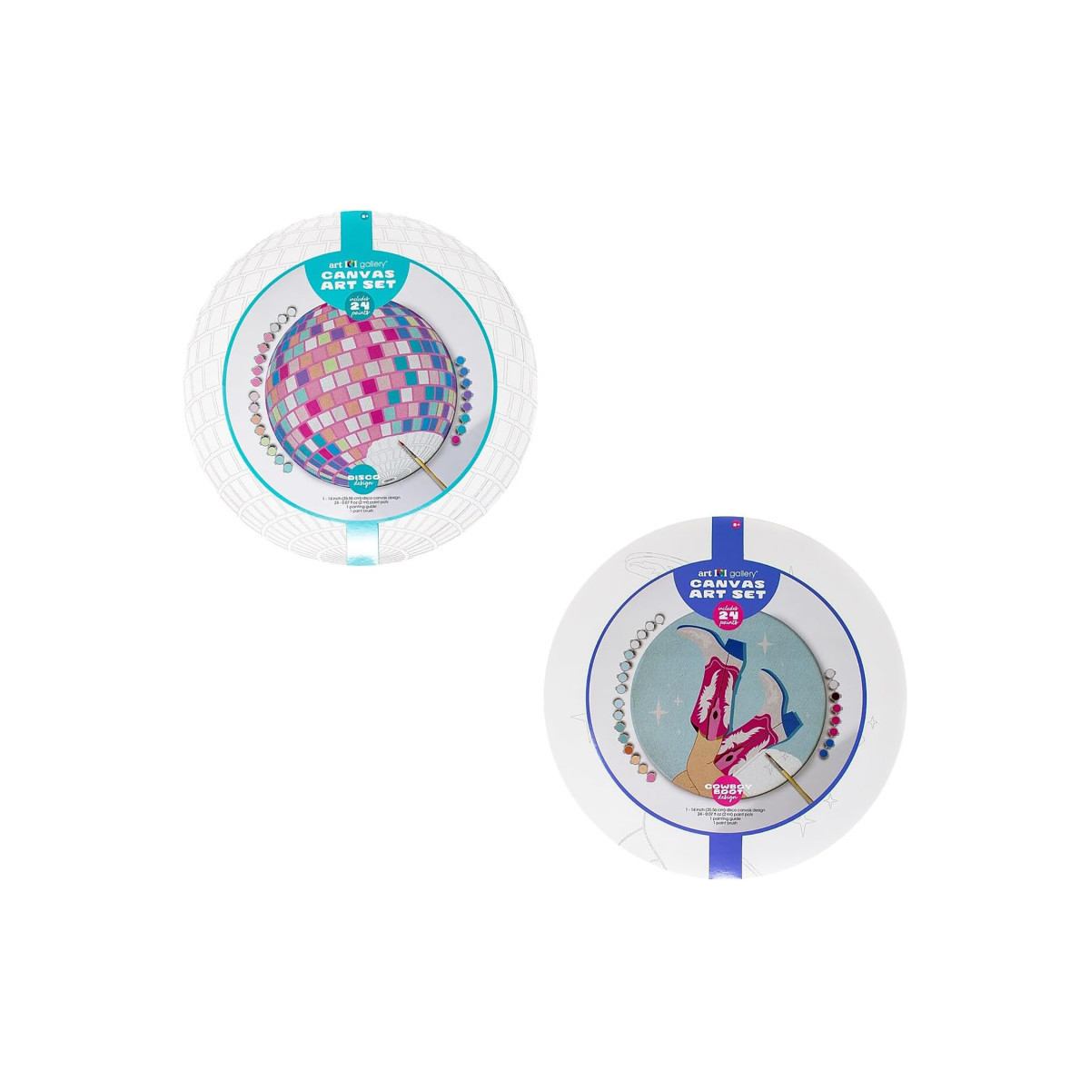 Our Art 101 Gallery Disco Cowgirl Two Pack Paintable Canvas Art Set includes two trendy designs, hand curated by our design team. Your two pack includes a 14-inch disco ball design and a 14-inch cowboy boot design, with each canvas also including 24 paint pods and a paint brush (for a total of 48 paint pods and 2 paint brushes). Each canvas has the design pre-printed as a guide, and also includes a painting guide for our Art 101 suggested color placement. Feel free to use the guide as you paint your canvases, or create your own design using the colors provided. Our two-pack canvases are perfect for hours of relaxing painting by yourself, or choose to share your canvases with a friend or loved one for a creative day of painting together. Use your finished canvases to add some extra color to your home decor by hanging them on your wall! We look forward to seeing what you create with our Canvas Art Sets!