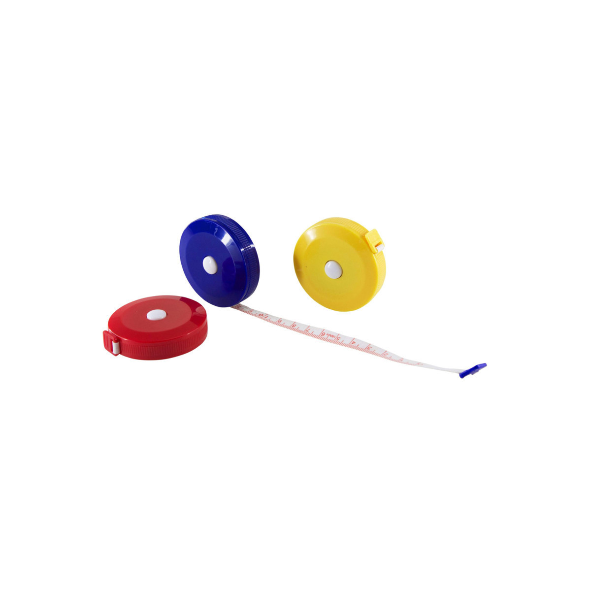 These colorful cloth tape measures are convenient and small enough to put in your shirt pocket or in your desk tray. This cloth tape measure extends up to 60" and retracts with the push of a button. Round plastic enclosure is 2" in diameter in assorted colors. Measures in inches and centimeters. Small enough to go anywhere and everywhere. Lightweight and easy to use. No worries if you're by yourself, it holds secure where you stop it. Includes 1 tape measure in assorted colors (no color choice). Sold as a pack of 3 tape measures.