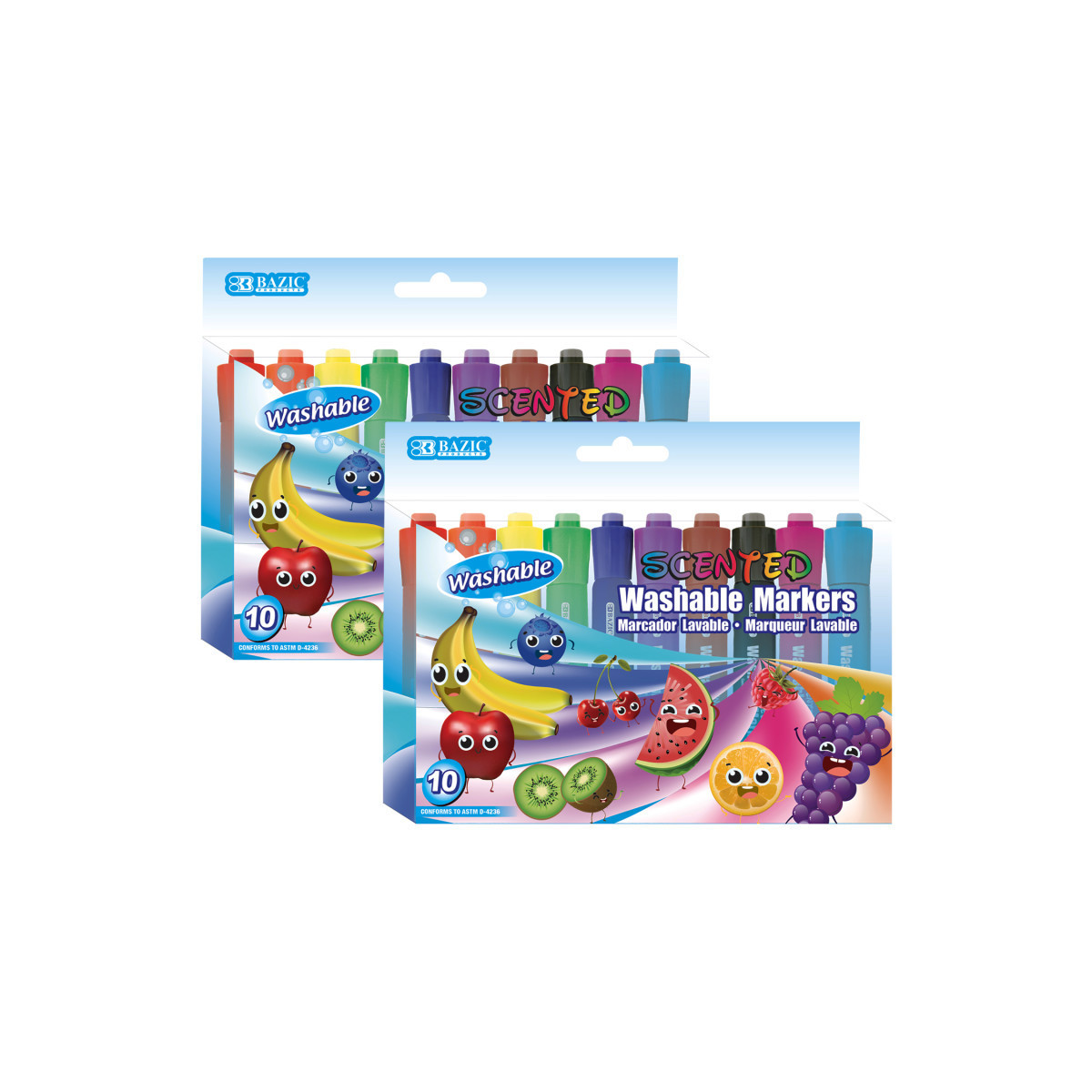 This set of scented washable markers is perfect for coloring and drawing. Each pack includes 10 different colors: red, pink, orange, yellow, green, light blue, blue, purple, brown, and black. Each color is infused with different scent. They all have chisel tips, which allows the artist to draw fine line when using the pointed tip, and broad line when using the chisel tip. Wash & Care tips: most clothing can be washed in warm or hot water. Do not use pre-wash or chlorine bleach, repeat laundering if necessary. Sold as 2 packs for a total of 20 markers.