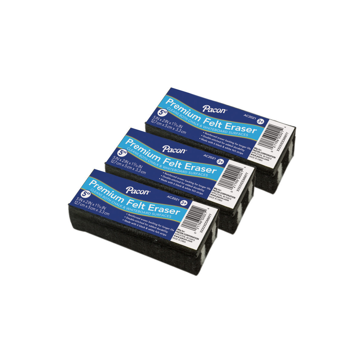 The Standard Eraser is a versatile and durable tool perfect for cleaning both chalkboards and dry erase surfaces. Ideal for classroom or home use, this eraser is great for teachers and students alike. It's constructed with six black and white felt strips that are double-stitched to the reinforced backing, ensuring lasting performance even with frequent use. The sturdy backing adds extra durability, extending the life of the eraser. Compact and easy to handle, it measures 5" x 2" x 1-5/16", making it a reliable choice for daily use on any writing surface. Sold as a pack of 3 erasers.