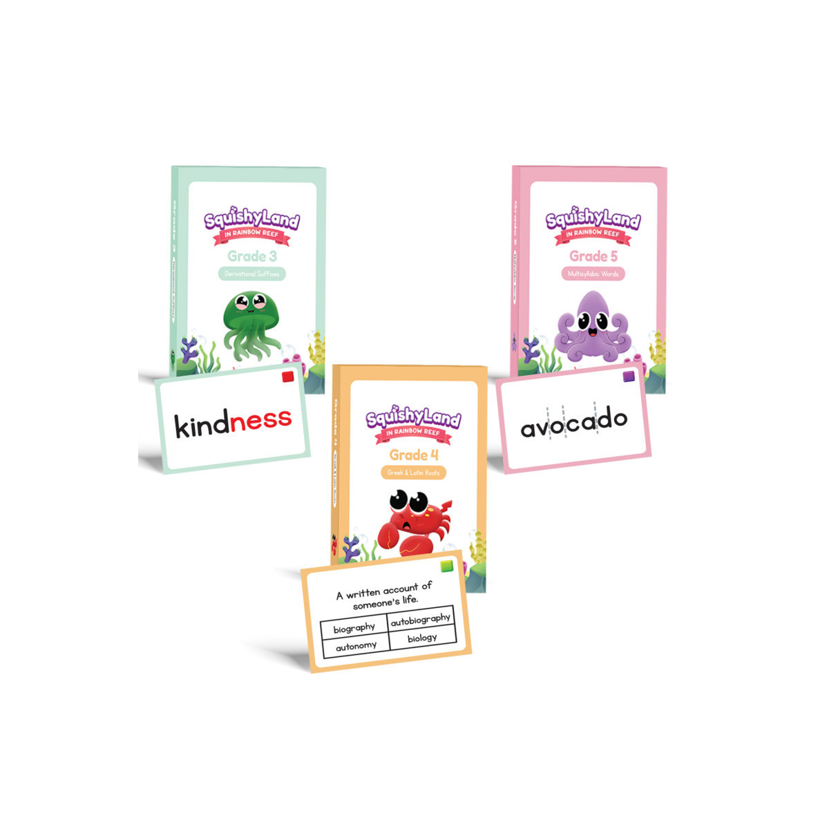 Take SquishyLand to the next level with the Expansion Card Packs for Grades 3–5! Designed for older learners, this add-on set introduces advanced literacy skills that are essential for vocabulary growth, decoding, and reading comprehension. With three curriculum-aligned decks—Derivational Suffixes (Grade 3), Greek and Latin Roots (Grade 4), and Multisyllabic Words (Grade 5)—kids strengthen foundational reading strategies while having fun. These multisensory, color-coded cards feature engaging aquatic themes and playful movement prompts that keep learners motivated while making literacy practice interactive and stress-free. Perfect for classrooms, homeschool, and literacy centers, the SquishyLand Expansion is an exciting way to extend the game for ages 8–11. Please note: this expansion includes cards only—no board or squishies. Pair with your original SquishyLand set to unlock new challenges and give older readers a literacy adventure they'll love!