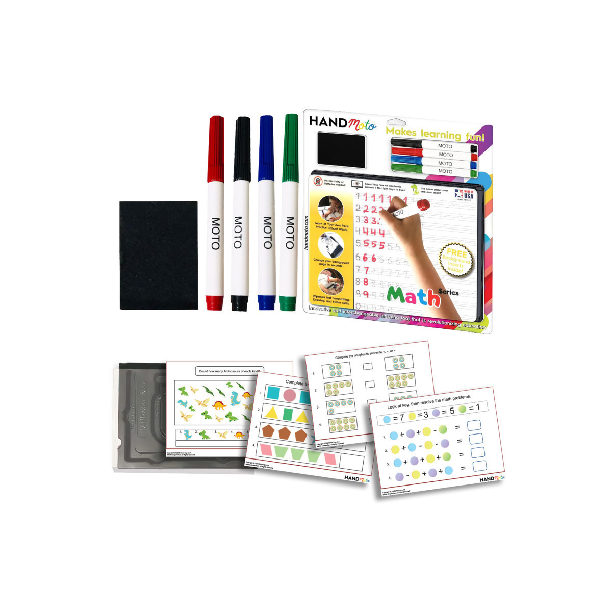 Boost your child's math skills while having fun with the HandMoto® Dry-Erase Learning Board - Math Series, a reusable and portable educational tool designed for children ages 4 to 6. This interactive math board introduces kids to numbers, addition, subtraction, and problem-solving through engaging, game-based learning. Featuring bright, colorful activity sheets and a mess-free dry-erase surface, children can practice repeatedly, reinforcing memory retention and logical reasoning. Each set includes a reusable dry-erase board, four colorful pens, a felt eraser pad, and ten activity sheets, allowing children to draw, color, and erase repeatedly for limitless creative practice. The HandMoto Math Board combines the benefits of visual learning, fine motor skill development, and critical thinking with a playful approach that motivates children to learn. Its customizable games adapt to different skill levels, allowing kids to progress from basic counting to more complex challenges. Safe, durable, and made in the USA with medical-grade materials, this learning board encourages collaborative play, attention span growth, and real-world application of math concepts, making it a perfect addition to homes, classrooms, and learning centers.