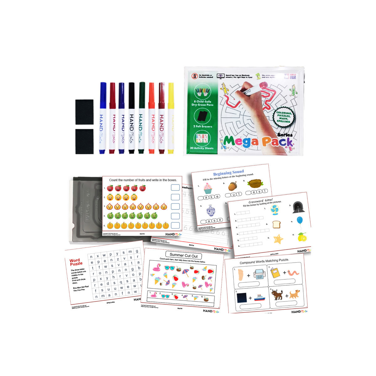 - Complete MegaPack Set: Includes 1 HandMoto board, 2 felt erasers, 8 dry-erase markers, and 30 reusable activity sheets.