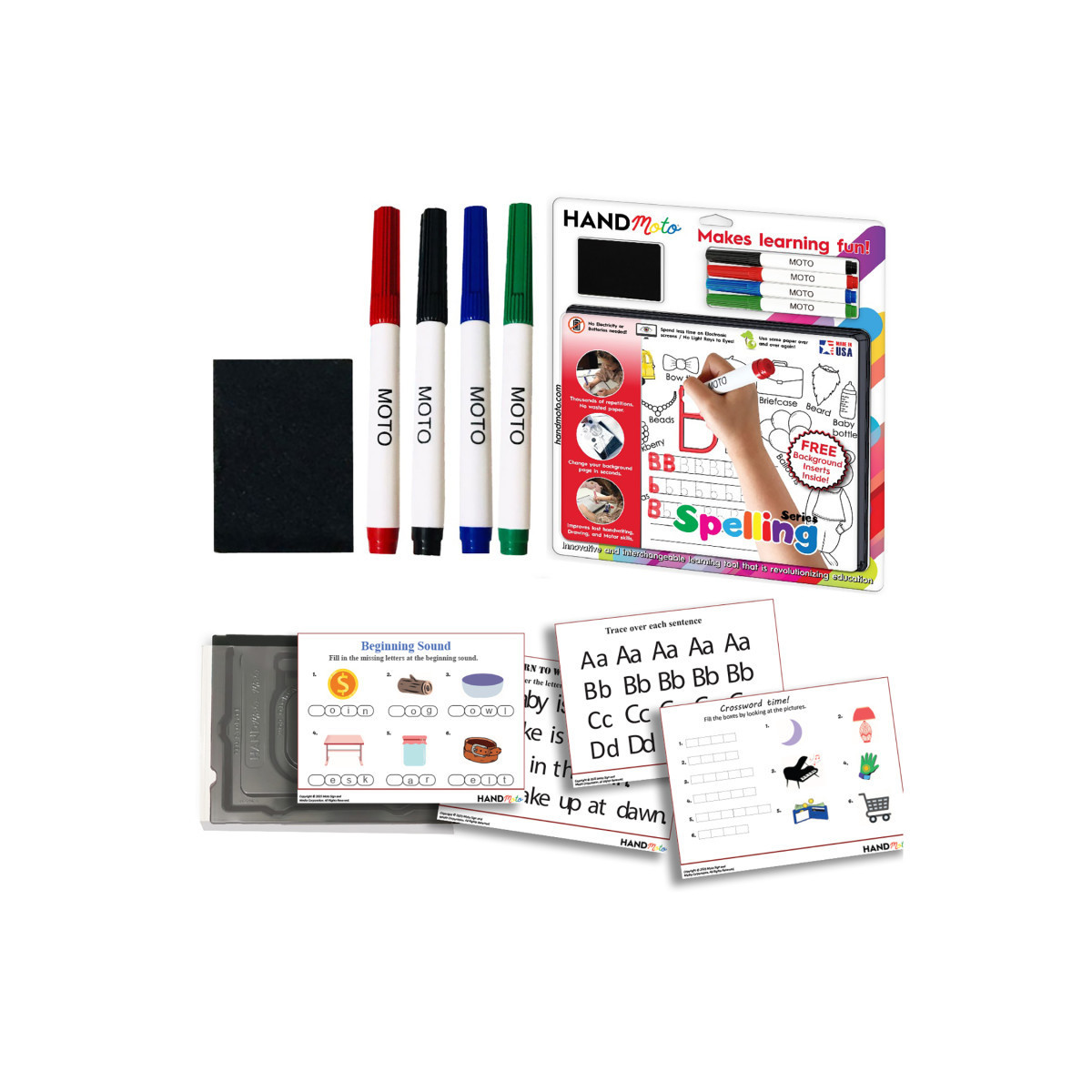 Elevate your child's literacy skills with the HandMoto® Dry-Erase Learning Board - Spelling Series, a fun and interactive educational tool designed for kids ages 3 to 6. This innovative spelling board turns learning into an engaging hands-on experience, perfect for both individual and group play. Each set includes a reusable dry-erase board, four colorful pens, a felt eraser pad, and ten activity sheets, allowing children to draw, color, and erase repeatedly for limitless creative practice. With vibrant colors and captivating activities, children can improve spelling, expand vocabulary, and strengthen fine motor skills while enjoying screen-free learning. Its durable, non-toxic construction and portable design make it ideal for home, classroom, or on-the-go use. Developed with input from educators and child development specialists, the HandMoto Spelling Board combines educational rigor with playful creativity, ensuring that young learners build a strong literacy foundation while having fun.