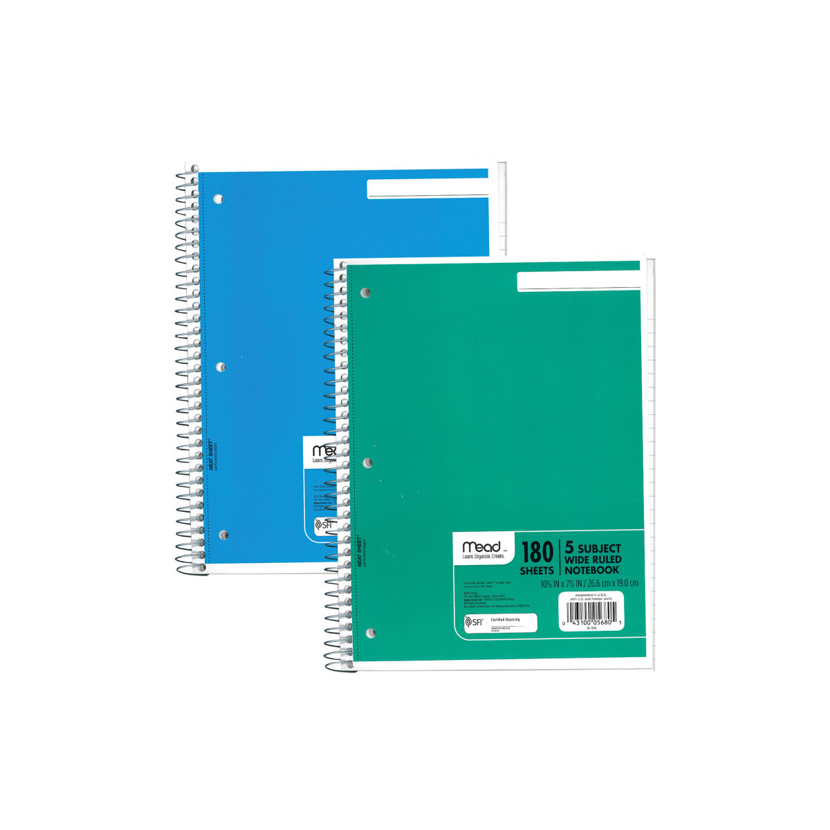 Mead Spiral 5 Subject Notebook is versatile and is ideal for a variety of uses including in-class assignments and homework. This spiral notebook comes in handy for your favorite class or any project. Comes with handy dividers and 180 wide ruled, double-sided sheets. Wide ruling is ideal for the younger student who needs more space between lines. Sheets measure 10-1/2" x 7-1/2" when torn out with an overall size of 10-1/2" x 8". Perforation easily tears out with clean edges. Notebook is 3-hole punched to store in your favorite binder. Covers are coated for durability. Sold as a pack of 2 in assorted cover colors: Red, Blue, and Green (no color choice).