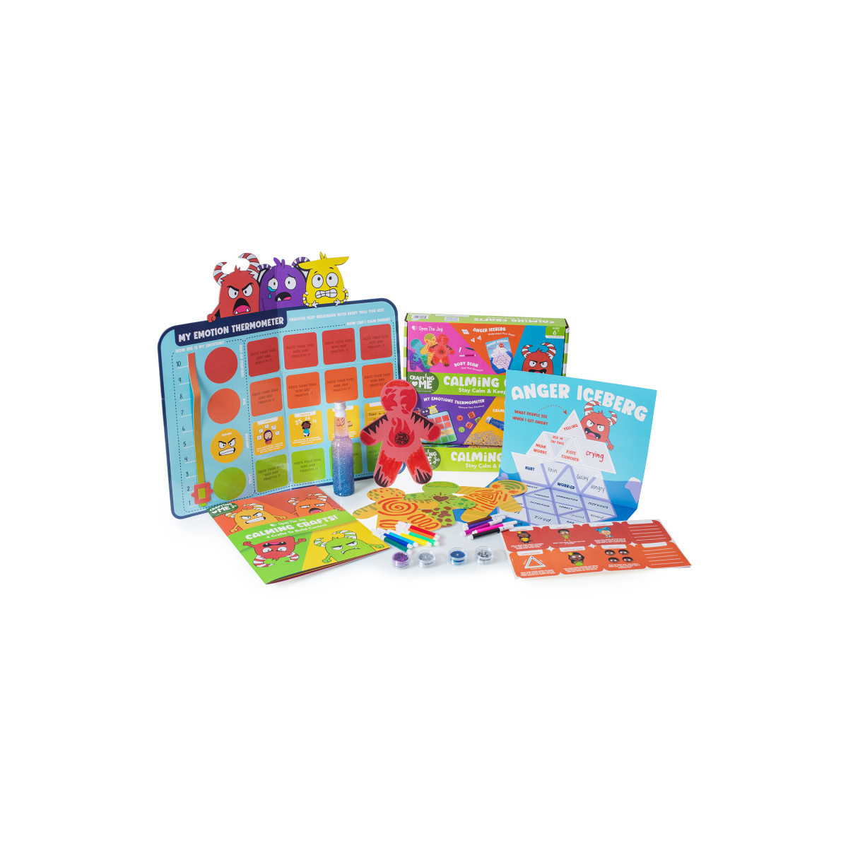 COMPLETE CALMING CRAFTS KIT: Includes an instruction booklet, anger iceberg poster, iceberg sticker sheet, 4 paper people, 12 mini markers, emotions thermometer board, feelings meter, calming tools sticker sheets, 4 levels of emotions stickers, bottle, funnel, glue (30ml), 2 fine glitter tubs, chunky glitter, star confetti, and bottle sticker for a stress-relieving DIY experience.