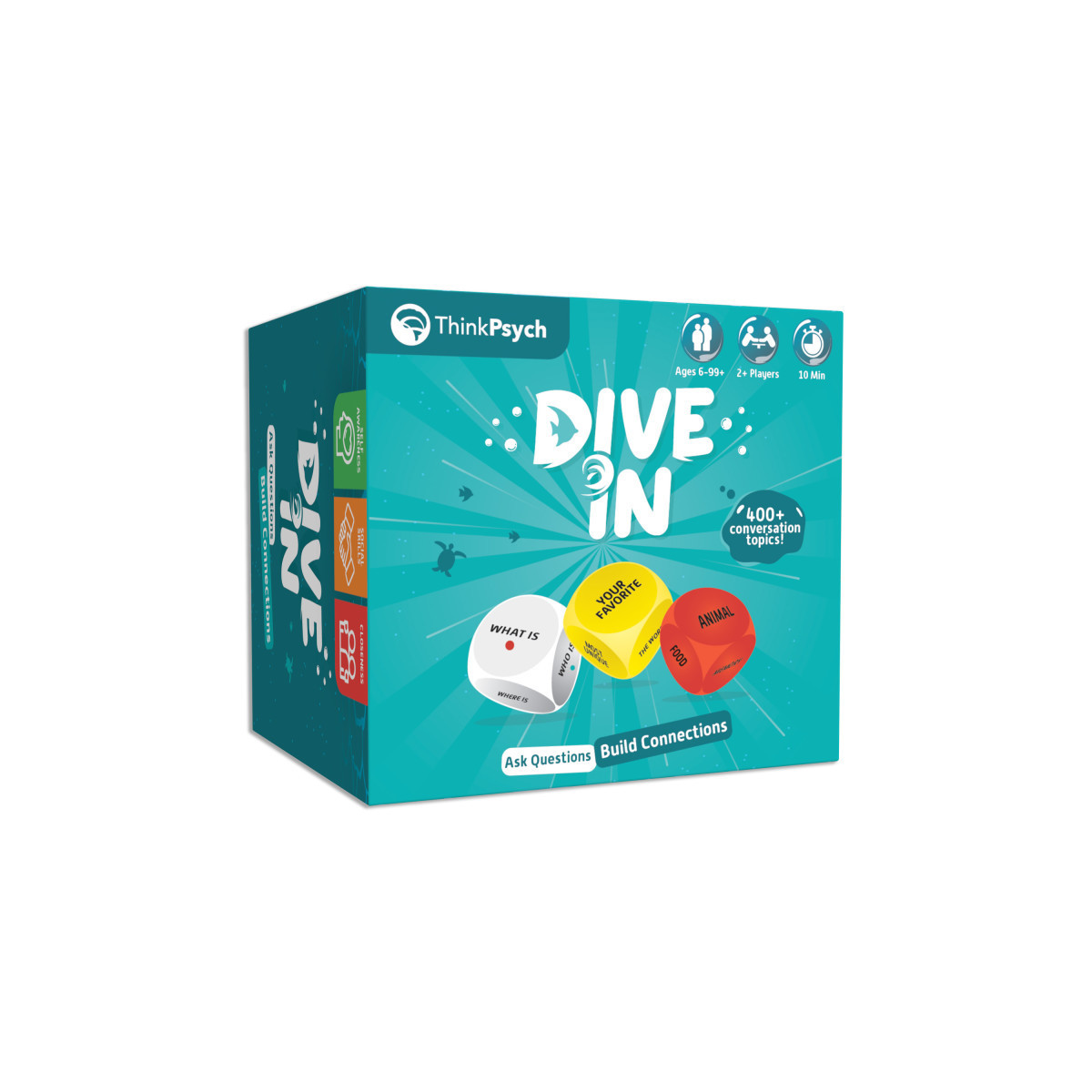 - START A CONVERSATION: Dive In stimulates thought-provoking discussions with over 400 unique and unexpected questions, fostering deeper connections among players of all ages.