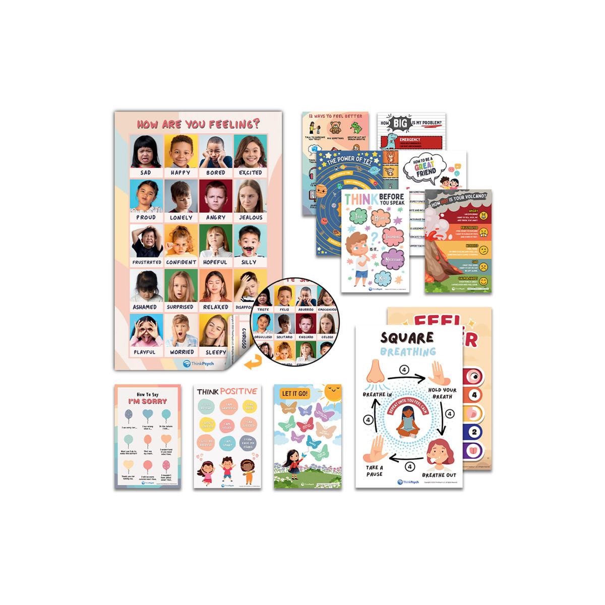 Help children build emotional intelligence and social skills with the ThinkPsych 12 Feelings & Life Skills Posters, the ultimate bilingual poster collection designed by psychologists. This engaging set includes 12 double-sided posters featuring English on one side and Spanish on the other, making them accessible for diverse classrooms, therapy settings, and homes. Each 11x17-inch poster uses real photos of kids to help children identify and relate to 20 different emotions—no confusing emojis here! The collection goes beyond emotions, teaching practical coping strategies, social skills like friendship and communication, and important life lessons to support emotional resilience. Crafted with commercial-grade lamination, these posters are built to withstand daily use and resist rips, spills, and tears. Whether you're a teacher, therapist, or parent, these posters are a powerful, ready-to-use tool to boost emotional wellbeing and communication. Make your calm down corner or SEL curriculum more effective with ThinkPsych—where social emotional learning is made easy.