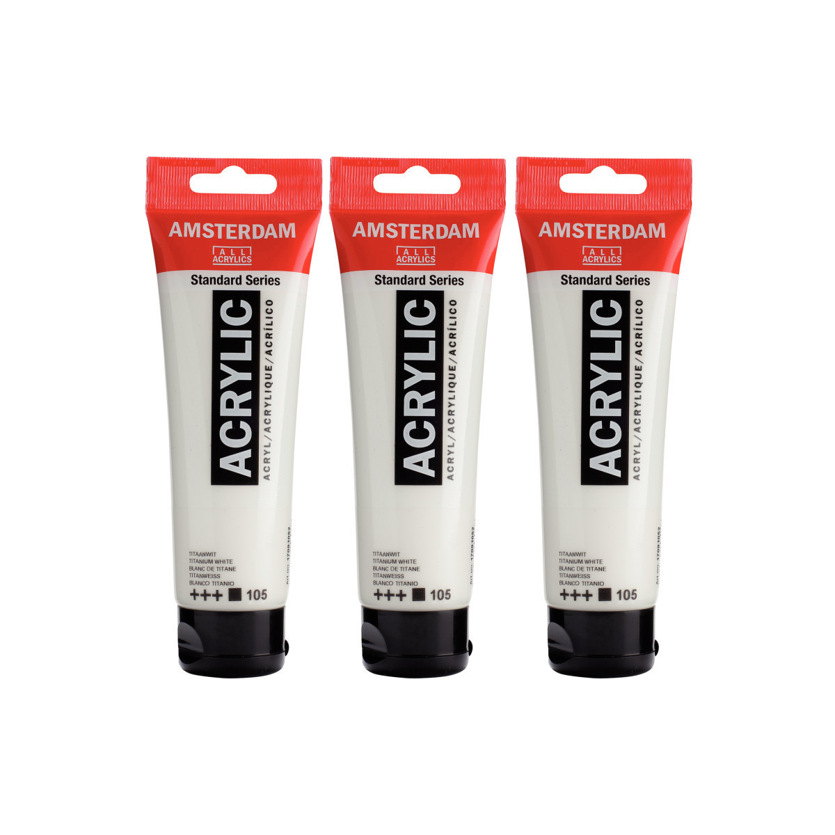 Amsterdam Standard Series acrylic paint in Titanium White (105) is an opaque color with an excellent lightfastness. Our Standard Series offers you the broadest range of remarkably vibrant acrylic colors. This versatile paint is easy to work with and offers a smooth application. Use the paint straight from the tube or thinned with a little bit of water or one of our acrylic mediums. Medium viscosity paint for visible brush strokes, texture and smooth coverage with a satin finish. Made with high-quality, lightfast pigments. Formulated with 100% acrylic resin binder, resulting in an exceptionally durable and flexible paint film with a uniform degree of gloss. Odorless, water-based formula that becomes waterproof and permanent when dry. Extensive range of 102 colors available in 20ml and 120ml tubes, of which up to 90 colors are also available in larger sizes. The range of colors includes both traditional and modern colors such as reflex and metallic variants. Adheres to virtually any slightly porous surface, including canvas, paper, cardboard, wood, stone and cement. Proudly crafted in the Netherlands. Sold as a pack of 3.