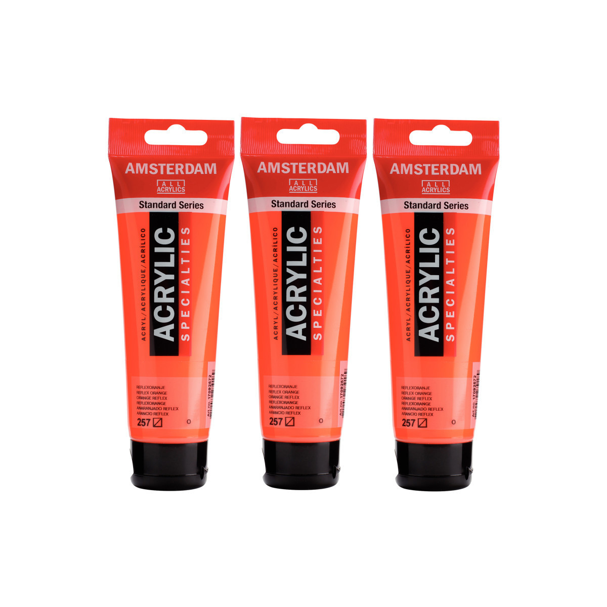 Amsterdam Standard Series acrylic paint in Reflex Orange (257) is a semi-transparent color with no lightfastness (˚). Our Standard Series offers you the broadest range of remarkably vibrant acrylic colors. This versatile paint is easy to work with and offers a smooth application. Use the paint straight from the tube or thinned with a little bit of water or one of our acrylic mediums. Medium viscosity paint for visible brush strokes, texture and smooth coverage with a satin finish. Made with high-quality, lightfast pigments. Formulated with 100% acrylic resin binder, resulting in an exceptionally durable and flexible paint film with a uniform degree of gloss. Odorless, water-based formula that becomes waterproof and permanent when dry. Extensive range of 102 colors available in 20ml and 120ml tubes, of which up to 90 colors are also available in larger sizes. The range of colors includes both traditional and modern colors such as reflex and metallic variants. Adheres to virtually any slightly porous surface, including canvas, paper, cardboard, wood, stone and cement. Proudly crafted in the Netherlands. Sold as a pack of 3.