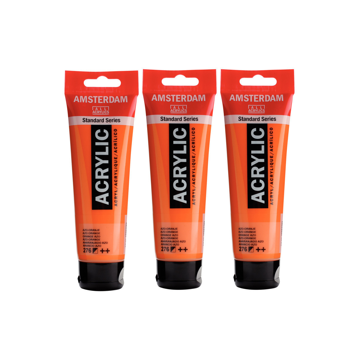 Amsterdam Standard Series acrylic paint in Azo orange (276) is a semi-opaque color with a very good lightfastness (++). Our Standard Series offers you the broadest range of remarkably vibrant acrylic colors. This versatile paint is easy to work with and offers a smooth application. Use the paint straight from the tube or thinned with a little bit of water or one of our acrylic mediums. Medium viscosity paint for visible brush strokes, texture and smooth coverage with a satin finish. Made with high-quality, lightfast pigments. Formulated with 100% acrylic resin binder, resulting in an exceptionally durable and flexible paint film with a uniform degree of gloss. Odorless, water-based formula that becomes waterproof and permanent when dry. Extensive range of 102 colors available in 20ml and 120ml tubes, of which up to 90 colors are also available in larger sizes. The range of colors includes both traditional and modern colors such as reflex and metallic variants. Adheres to virtually any slightly porous surface, including canvas, paper, cardboard, wood, stone and cement. Proudly crafted in the Netherlands. Sold as a pack of 3.