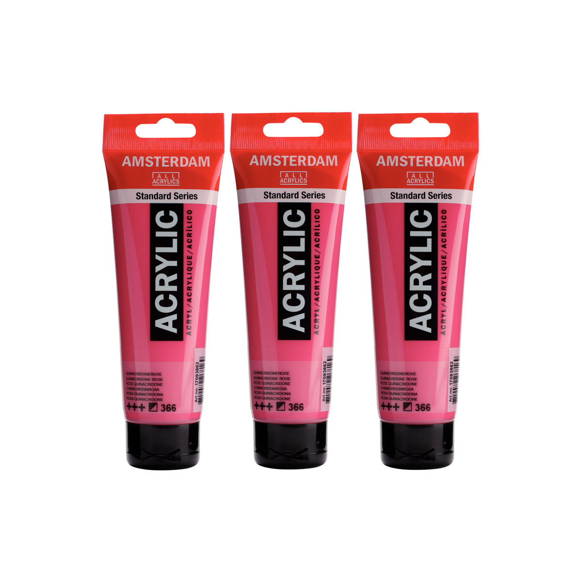 Amsterdam Standard Series acrylic paint in Quinacridone Rose (366) is a semi-opaque color with an excellent lightfastness. Our Standard Series offers you the broadest range of remarkably vibrant acrylic colors. This versatile paint is easy to work with and offers a smooth application. Use the paint straight from the tube or thinned with a little bit of water or one of our acrylic mediums. Medium viscosity paint for visible brush strokes, texture and smooth coverage with a satin finish. Made with high-quality, lightfast pigments. Formulated with 100% acrylic resin binder, resulting in an exceptionally durable and flexible paint film with a uniform degree of gloss. Odorless, water-based formula that becomes waterproof and permanent when dry. Extensive range of 102 colors available in 20ml and 120ml tubes, of which up to 90 colors are also available in larger sizes. The range of colors includes both traditional and modern colors such as reflex and metallic variants. Adheres to virtually any slightly porous surface, including canvas, paper, cardboard, wood, stone and cement. Proudly crafted in the Netherlands. Sold as a pack of 3.