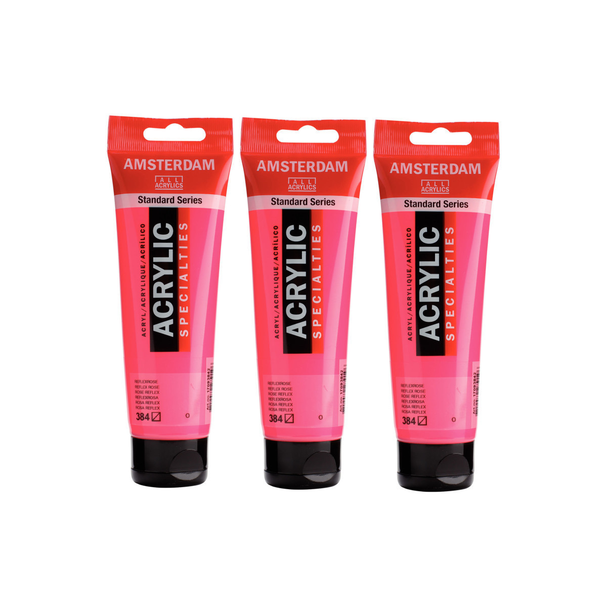 Amsterdam Standard Series acrylic paint in Reflex Rose (384) is a semi-transparent color with no lightfastness (˚). Our Standard Series offers you the broadest range of remarkably vibrant acrylic colors. This versatile paint is easy to work with and offers a smooth application. Use the paint straight from the tube or thinned with a little bit of water or one of our acrylic mediums. Medium viscosity paint for visible brush strokes, texture and smooth coverage with a satin finish. Made with high-quality, lightfast pigments. Formulated with 100% acrylic resin binder, resulting in an exceptionally durable and flexible paint film with a uniform degree of gloss. Odorless, water-based formula that becomes waterproof and permanent when dry. Extensive range of 102 colors available in 20ml and 120ml tubes, of which up to 90 colors are also available in larger sizes. The range of colors includes both traditional and modern colors such as reflex and metallic variants. Adheres to virtually any slightly porous surface, including canvas, paper, cardboard, wood, stone and cement. Proudly crafted in the Netherlands. Sold as a pack of 3.