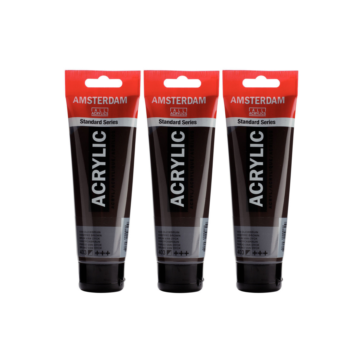 Amsterdam Standard Series acrylic paint in Vandyke Brown (403) is a semi-opaque color with an excellent lightfastness. Our Standard Series offers you the broadest range of remarkably vibrant acrylic colors. This versatile paint is easy to work with and offers a smooth application. Use the paint straight from the tube or thinned with a little bit of water or one of our acrylic mediums. Medium viscosity paint for visible brush strokes, texture and smooth coverage with a satin finish. Made with high-quality, lightfast pigments. Formulated with 100% acrylic resin binder, resulting in an exceptionally durable and flexible paint film with a uniform degree of gloss. Odorless, water-based formula that becomes waterproof and permanent when dry. Extensive range of 102 colors available in 20ml and 120ml tubes, of which up to 90 colors are also available in larger sizes. The range of colors includes both traditional and modern colors such as reflex and metallic variants. Adheres to virtually any slightly porous surface, including canvas, paper, cardboard, wood, stone and cement. Proudly crafted in the Netherlands. Sold as a pack of 3.