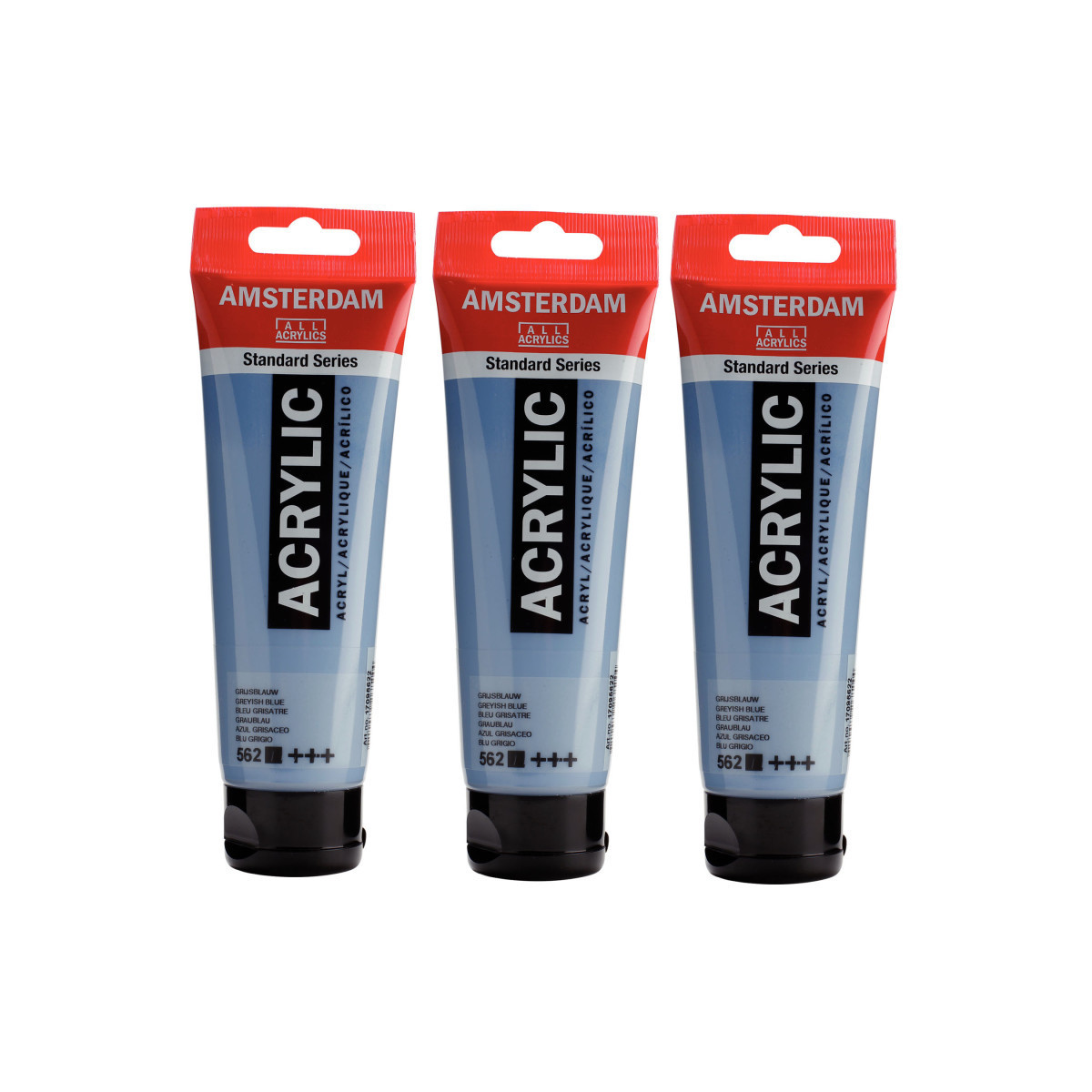 Amsterdam Standard Series acrylic paint in Grayish Blue (562) is an opaque color with an excellent lightfastness. Our Standard Series offers you the broadest range of remarkably vibrant acrylic colors. This versatile paint is easy to work with and offers a smooth application. Use the paint straight from the tube or thinned with a little bit of water or one of our acrylic mediums. Medium viscosity paint for visible brush strokes, texture and smooth coverage with a satin finish. Made with high-quality, lightfast pigments. Formulated with 100% acrylic resin binder, resulting in an exceptionally durable and flexible paint film with a uniform degree of gloss. Odorless, water-based formula that becomes waterproof and permanent when dry. Extensive range of 102 colors available in 20ml and 120ml tubes, of which up to 90 colors are also available in larger sizes. The range of colors includes both traditional and modern colors such as reflex and metallic variants. Adheres to virtually any slightly porous surface, including canvas, paper, cardboard, wood, stone and cement. Proudly crafted in the Netherlands. Sold as a pack of 3.