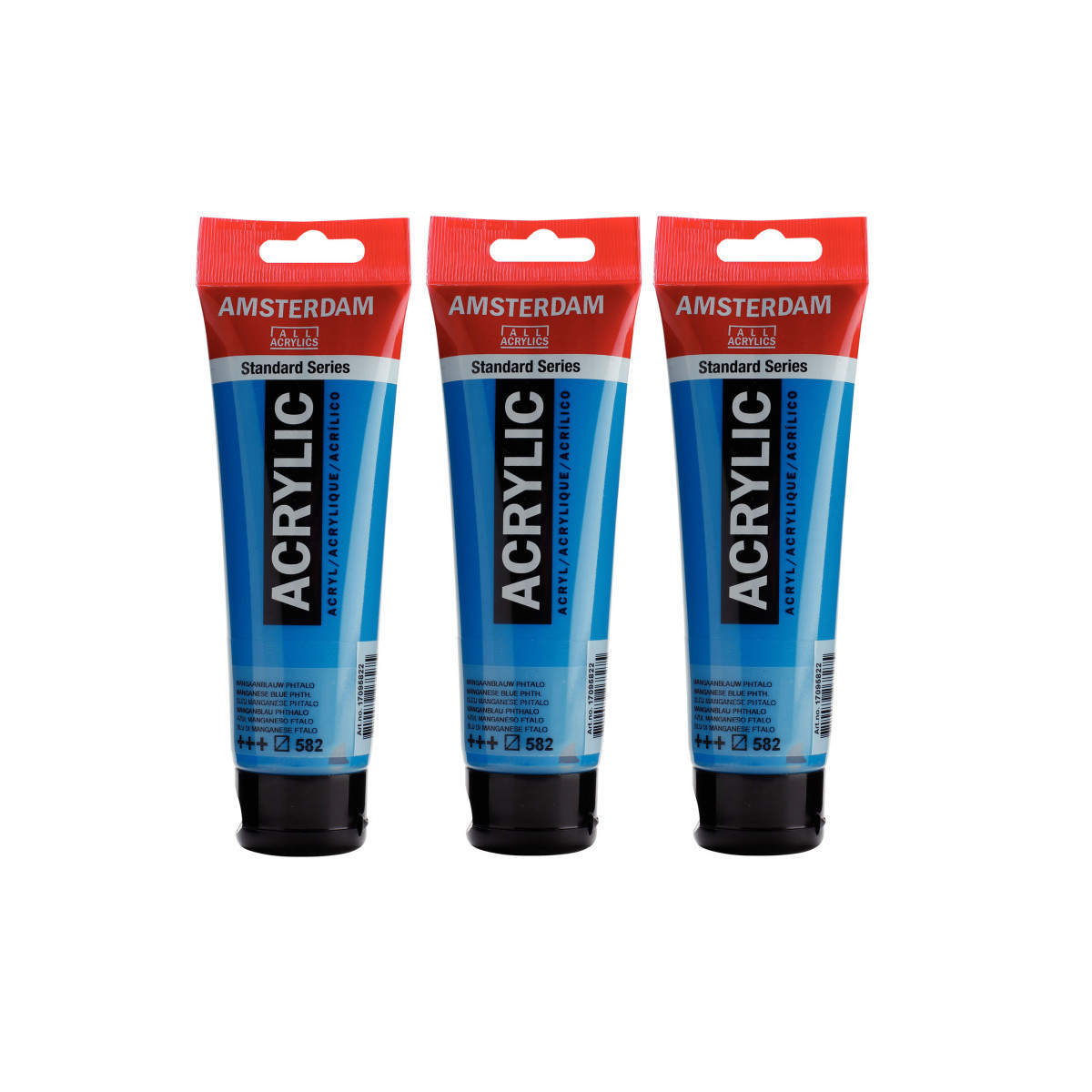 Amsterdam Standard Series acrylic paint in Manganese Blue Phthalo (582) is a semi-transparent color with an excellent lightfastness. Our Standard Series offers you the broadest range of remarkably vibrant acrylic colors. This versatile paint is easy to work with and offers a smooth application. Use the paint straight from the tube or thinned with a little bit of water or one of our acrylic mediums. Medium viscosity paint for visible brush strokes, texture and smooth coverage with a satin finish. Made with high-quality, lightfast pigments. Formulated with 100% acrylic resin binder, resulting in an exceptionally durable and flexible paint film with a uniform degree of gloss. Odorless, water-based formula that becomes waterproof and permanent when dry. Extensive range of 102 colors available in 20ml and 120ml tubes, of which up to 90 colors are also available in larger sizes. The range of colors includes both traditional and modern colors such as reflex and metallic variants. Adheres to virtually any slightly porous surface, including canvas, paper, cardboard, wood, stone and cement. Proudly crafted in the Netherlands. Sold as a pack of 3.