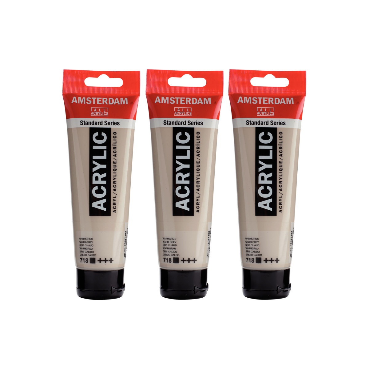 Amsterdam Standard Series acrylic paint in Warm Gray (718) is an opaque color with an excellent lightfastness. Our Standard Series offers you the broadest range of remarkably vibrant acrylic colors. This versatile paint is easy to work with and offers a smooth application. Use the paint straight from the tube or thinned with a little bit of water or one of our acrylic mediums. Medium viscosity paint for visible brush strokes, texture and smooth coverage with a satin finish. Made with high-quality, lightfast pigments. Formulated with 100% acrylic resin binder, resulting in an exceptionally durable and flexible paint film with a uniform degree of gloss. Odorless, water-based formula that becomes waterproof and permanent when dry. Extensive range of 102 colors available in 20ml and 120ml tubes, of which up to 90 colors are also available in larger sizes. The range of colors includes both traditional and modern colors such as reflex and metallic variants. Adheres to virtually any slightly porous surface, including canvas, paper, cardboard, wood, stone and cement. Proudly crafted in the Netherlands. Sold as a pack of 3.