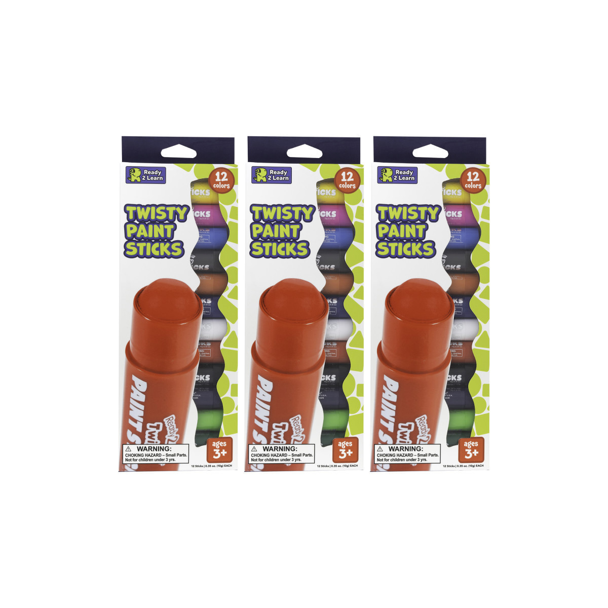 Give youngsters a smooth, mess-free introduction to painting! This set of silky-smooth, quick-drying paint sticks features 12 vibrant colors. There's no need for cleaning brushes or adding water. Offer children a more refined tip than brushes of a similar size. Work with paint while maintaining the creative control of a large crayon or marker. The compact tubes are perfect for little hands to hold. Paint on paper, windows, rocks, wood and more. Simply uncap, twist and create. Each stick twists up and down for easy use, cleanup and storage. Wash paint off of skin, clothes and other surfaces with ease. These colorful paint sticks are ideal for school projects, DIY crafts, window art and more. Includes: 12 colored paint sticks. For ages 3+. Size of each paint stick: 3.5"L x 0.75"W. Sold as 3 packs, with 12 per pack.