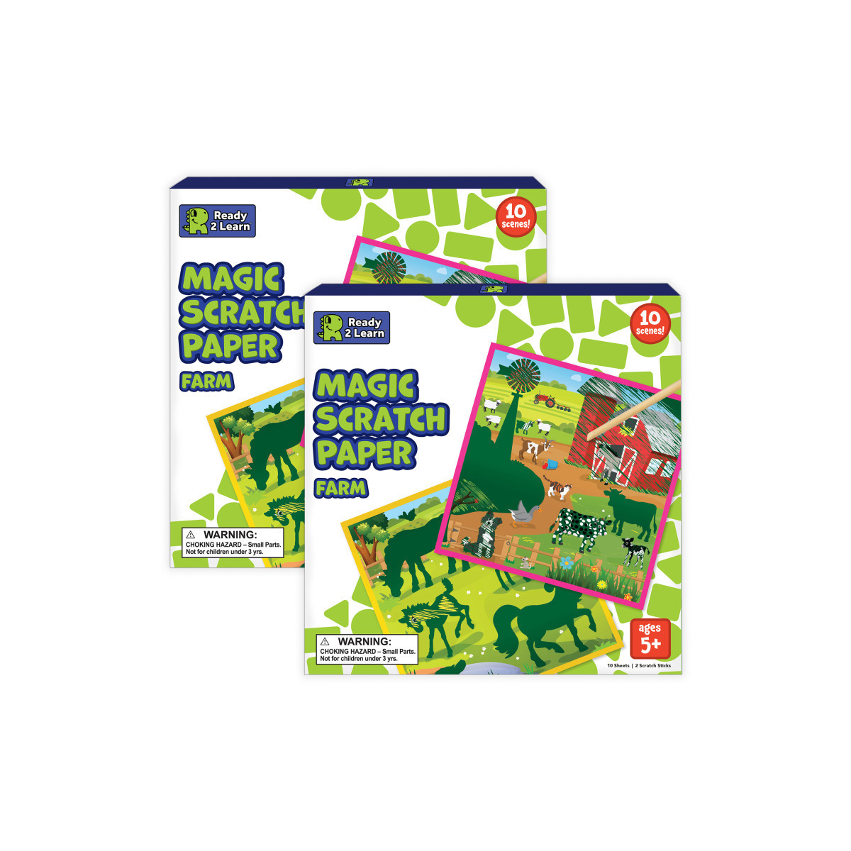 10 SCENES -- This scratch art kit features 10 different activity boards. Use the 2 bamboo scratch sticks to reveal vibrant, farm scenes!