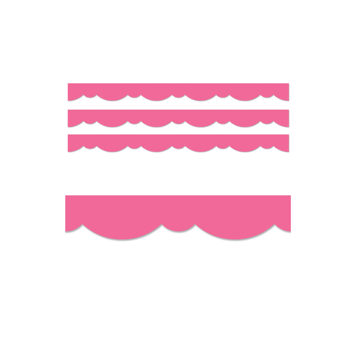 A fun, fresh twist on a solid border! This Pink Stylish Scallops EZ Border features a playful double scallop design to create a neat and easy way to edge any bulletin board or classroom display. Also great for use on bulletin boards in an office, a church, or a college dorm. With its versatile scallop design, this bulletin board border can be used alone to create a basic look or layered with another border for a more designer look. These EZ borders come in smaller strips, which are easier to manage and store. Each package comes with enough borders to complete 2 full bulletin boards. Use this pink EZ border for seasonal and holiday displays for Valentine's Day, Easter, spring, and Breast Cancer Awareness Month. Sold as 3 packs. Each pack includes 24 strips measuring 2-3/4" x 24" for a total of 48 feet.