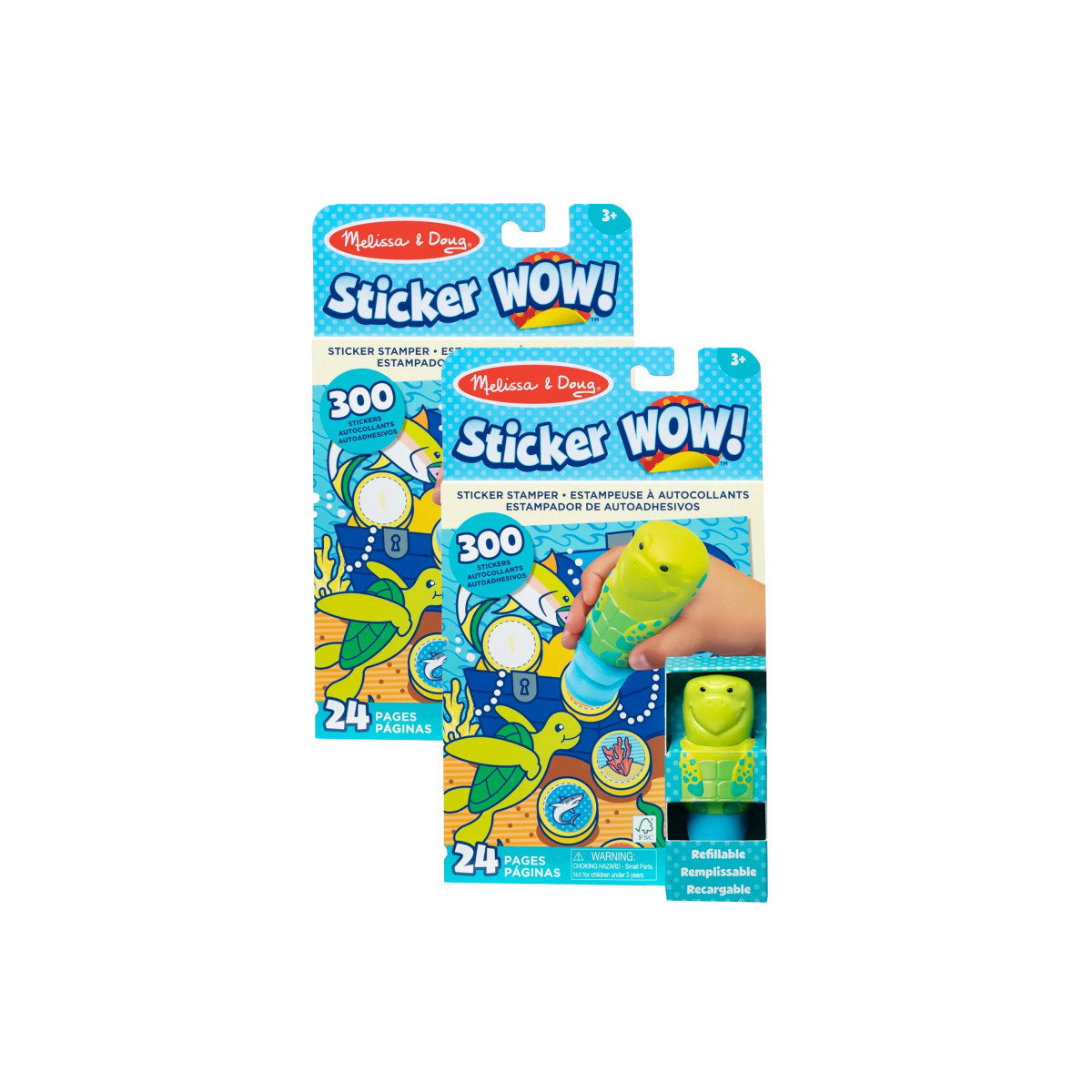 Melissa & Doug Sticker WOW!™ is a whole new way to play with stickers! Let the adorable, collectible Kelp the Sea Turtle stamp, stamp, stamp its way through 24 pages of fun-filled, ocean-themed counting, matching, and search-and-find activities. The refillable sticker stamper comes pre-loaded with a sticker stack of 300 assorted stickers – with 100 unique designs in every stack, each sticker is a surprise! Themed refill packs are sold separately and are compatible with any Sticker WOW!™ sticker stamper. Stickers are not reusable, but are easy to remove if necessary. Fill in the activity pages and use for creative art projects, such as bookmarks, posters, cards, and more. Easy-to-remove stickers and the convenient on-the-go format with built-in sticker stamper storage makes Sticker WOW!™ (patent pending) a great mess-free travel activity. Sticker WOW!™ promotes fine motor skills, encourages creative play, and it's satisfying, fidget fun! Sold as 2 sets.