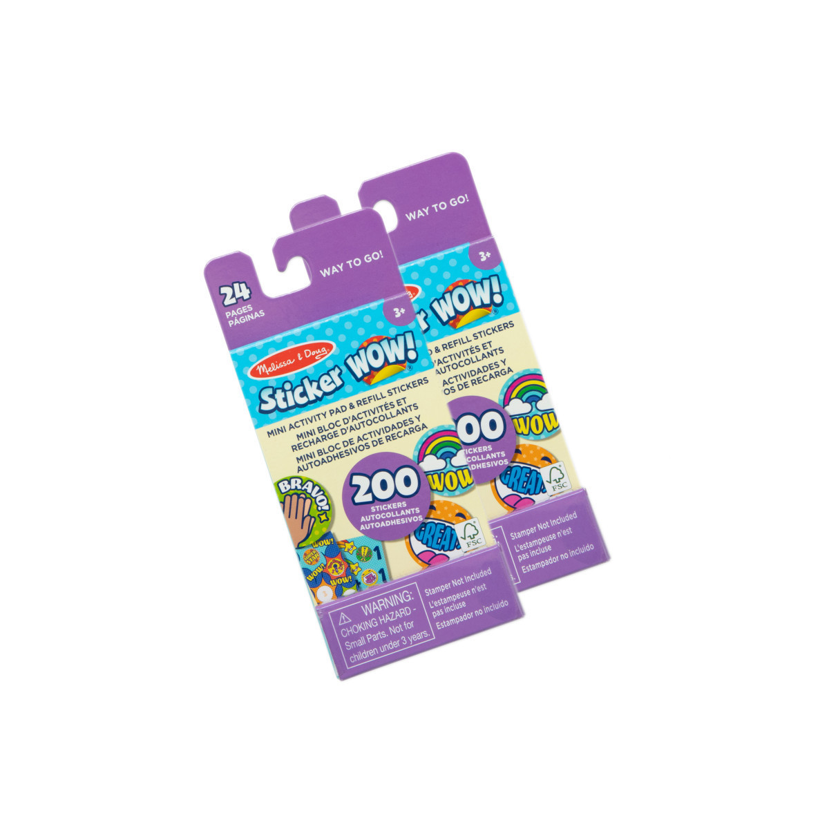 Melissa & Doug Sticker WOW!™ is a whole new way to play with stickers! Pop the convenient sticker stack of 200 assorted Way to Go! (encouragement and reward) stickers into any Sticker WOW!™ Sticker Stamper cartridge, and stamp, stamp, stamp through 24 mini pages (approximately 2.25 by 4.25 inches) of fun-filled counting and matching activities. With 100 unique designs in the sticker stack, each sticker stamped is a surprise. Sticker WOW!™ refill stickers are not reusable but are easy to remove if necessary and are great for creative arts and crafts projects. Refill stickers are compatible with all the cute and collectible Sticker WOW!™ sticker stampers (sticker stamper not included). Sticker WOW!™ (patent pending) promotes fine motor skills, encourages creative play, and it's satisfying, fidget fun! This product is certified by the Forest Stewardship Council. FSC certification ensures that products come from responsibly managed forests that provide environmental, social, and economic benefits, and that forests are protected for future generations. Please note that FSC certification applies to new inventory only (FSC C156584). Sold as 2 sets.