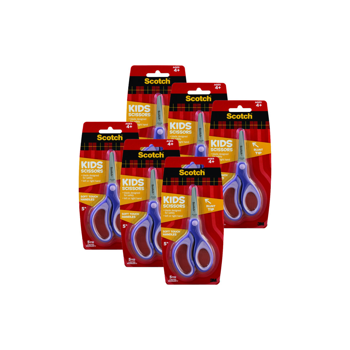 Scotch 5" Soft Touch Blunt Tip Kids Scissors feature a soft grip handle made for small, growing hands. Designed for safe right and left-handed use for all kids. Scotch Kids Scissors cut precisely, making them great for a variety of kid-friendly school projects– they are a must-have on your school supplies list for back-to-school. Easy to use at home for enriching supervised activities and crafts. Safe for the classroom, Scotch Kids Scissors feature quality stainless steel blades with a sharp edge, blunt tip, and long cutting life. Cuts through paper, card stock, tape, foam, pictures and more. The best projects start with Scotch Brand Scissors. Sold as a pack of 6.