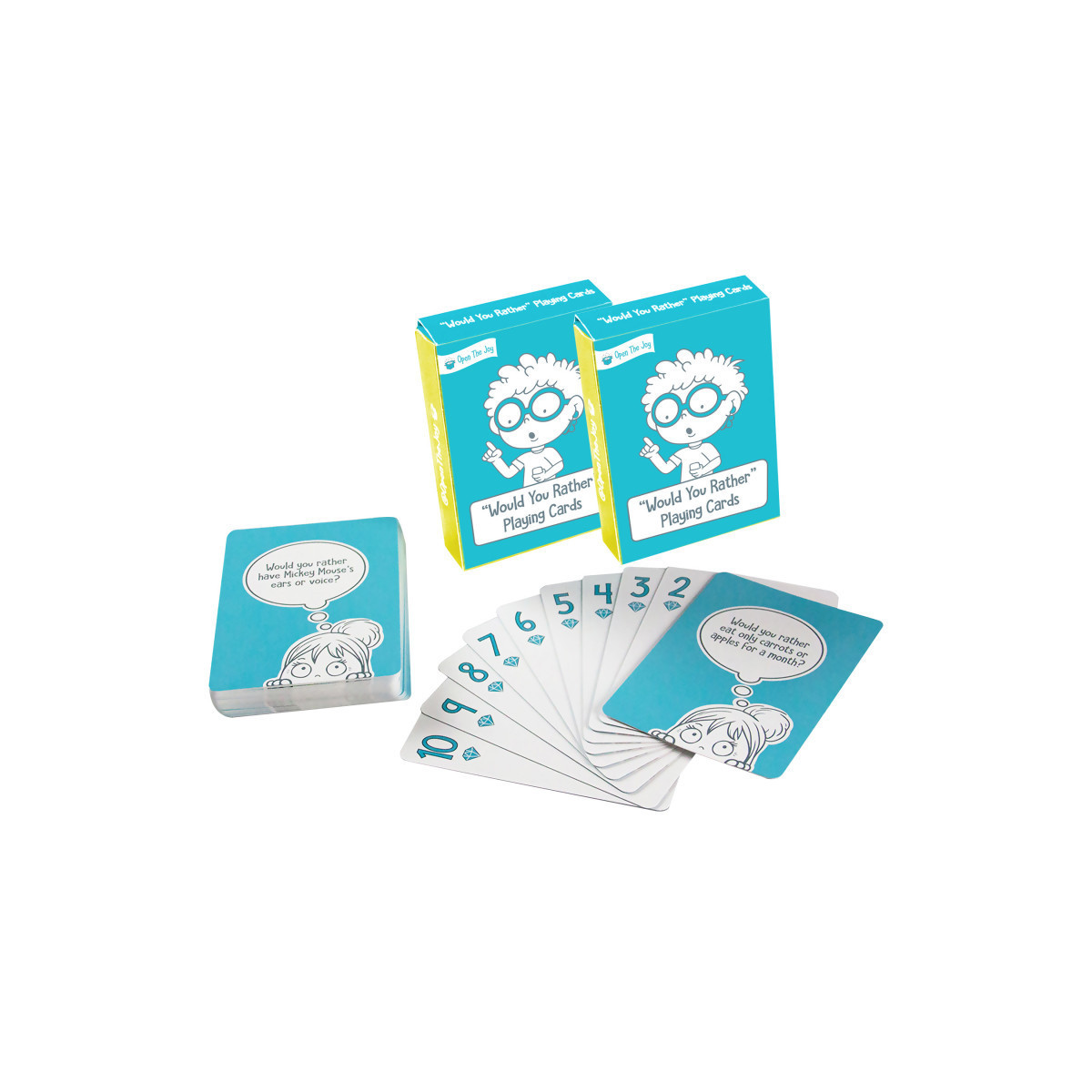 Play Cards: Standard deck of playing cards with the back of every card featuring a silly and engaging “Would You Rather” question.