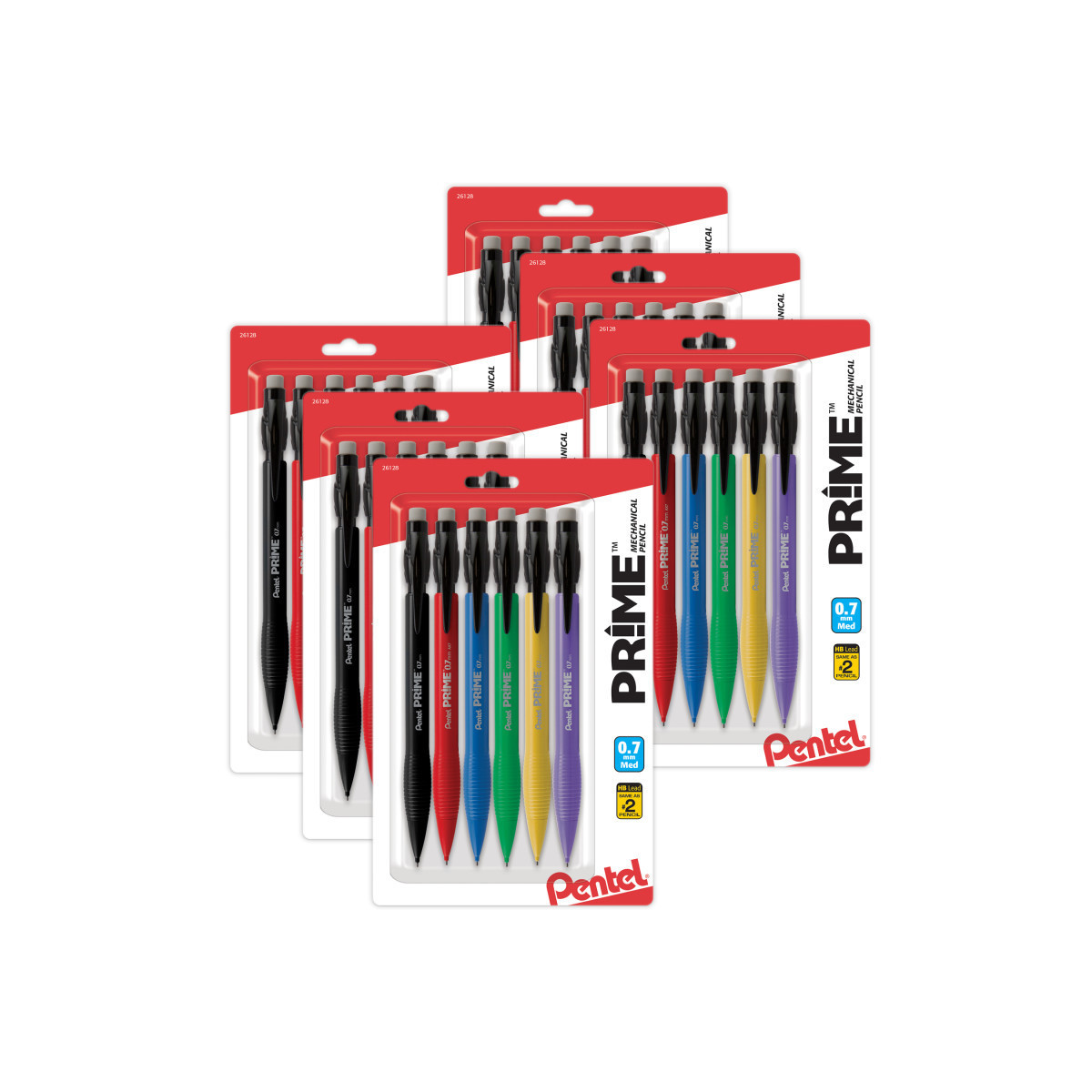 PRIME™ offers Pentel quality in an economy pencil. Molded grip is grooved for writing comfort. Pre-loaded with Super Hi-Polymer® lead. Never needs sharpening, is super strong and produces a clear dark line. 0.7mm (medium). Latex-free eraser. Each pack includes 6 mechanical pencils in assorted barrel colors. Sold as 6 packs.