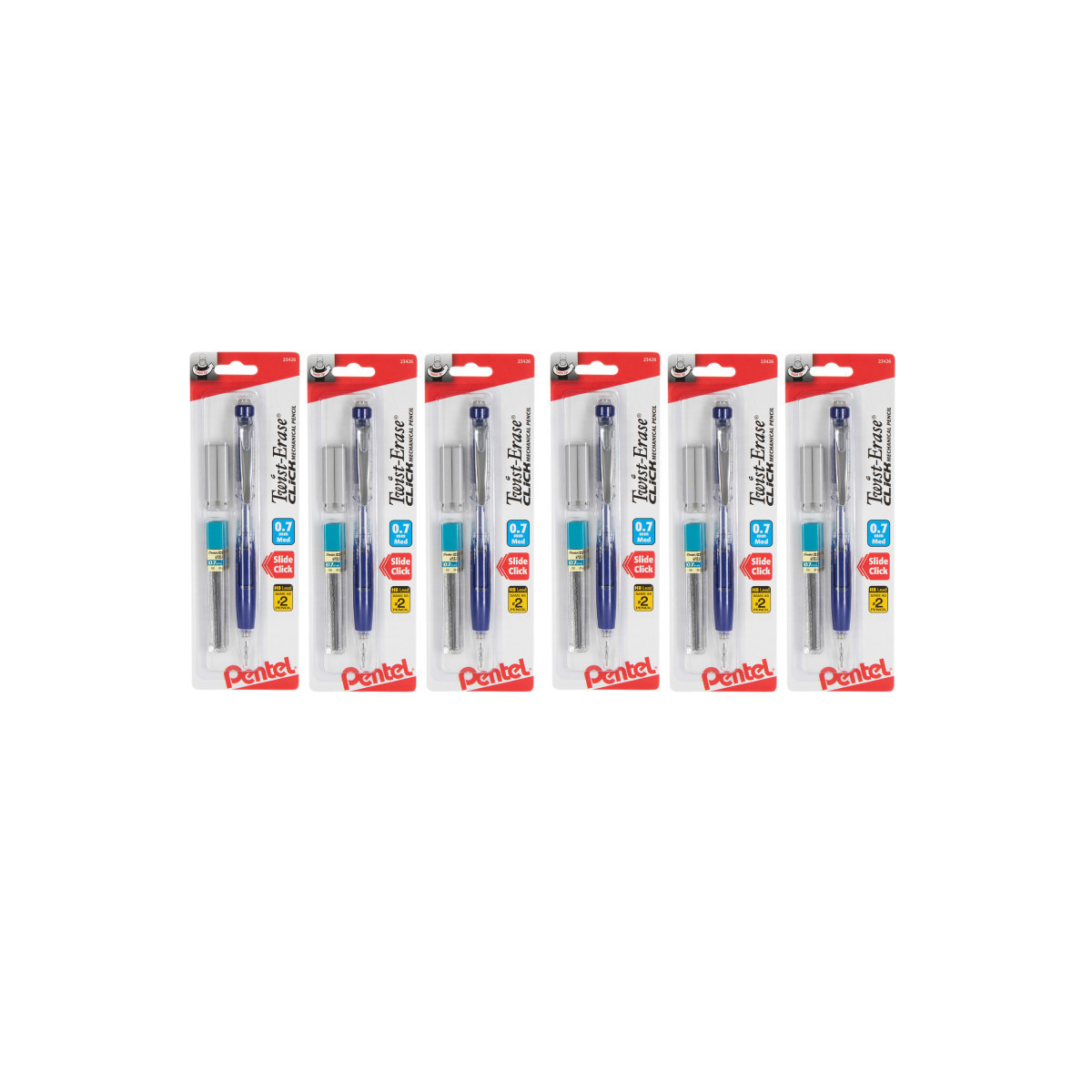 Twist-Erase® Click features clear barrels with color accents. Quick-click side button advances lead. Pre-loaded with Super Hi-Polymer® HB 0.7mm lead. Quick-click side button advances lead without interrupting your writing. Clear barrels with color accents for a stylish twist on pencils. Mistakes are no match for the larger than ordinary and long lasting twist-up eraser. Extended comfort grip (also latex-free), perfect no matter how you hold your pencil. Includes 1 pencil in assorted colors (no color choice) with lead and 2 erasers. Sold as a pack of 6.