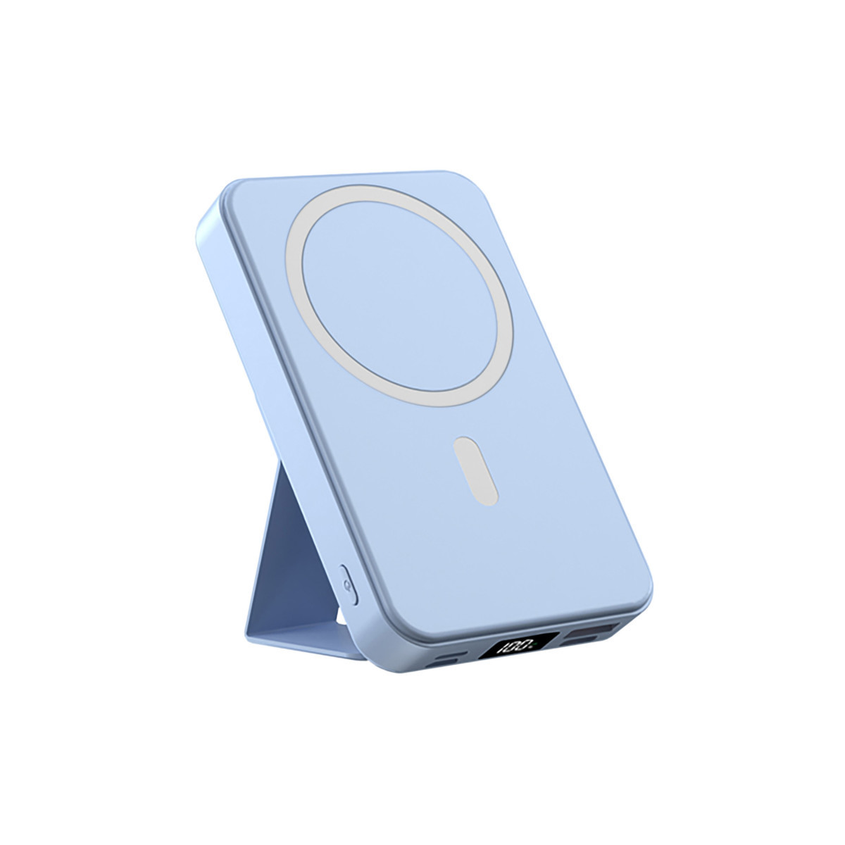 Stay fully charged wherever you go with the 10,000mAh Magnetic Wireless Power Bank, designed for convenience, power, and portability. Equipped with a high-capacity 10,000mAh battery, this wireless charger delivers reliable all-day power—capable of charging an iPhone 16/15/14/13/12 Pro up to 2 times or an iPhone 16/15/14/13/12 Pro Max & 16/15/14/13/12 Plus up to 1.5 times. The strong magnetic adsorption ensures a secure and seamless connection to your device, while the built-in LED digital display shows the exact battery percentage at a glance, so you're never caught off guard. Featuring a foldable stand, this magnetic power bank doubles as a phone holder for watching videos or video calling hands-free—horizontally or vertically.