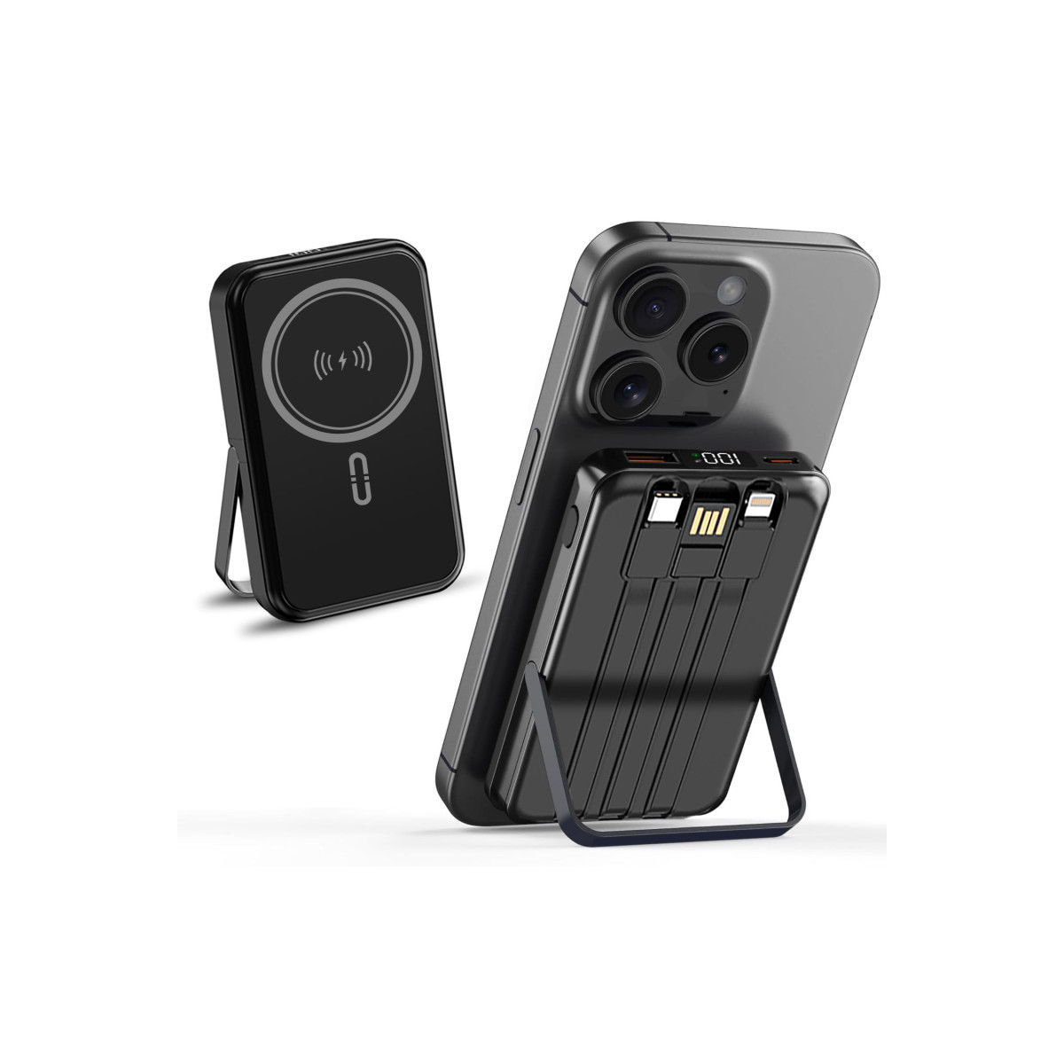 Stay powered anywhere with the 10,000mAh Magnetic Wireless Power Bank, the ultimate portable charging solution for iPhone users on the go. Designed with a high-density 10,000mAh battery, this compact power bank provides reliable, all-day energy—charging your iPhone 16/15/14/13/12 Pro up to two times and iPhone 16/15/14/13/12 Pro Max & 16/15/14/13/12 Plus up to 1.5 times. Featuring strong magnetic adsorption technology and nano-grip precision, it securely attaches to your device for seamless MagSafe-style charging. The LED digital display lets you monitor exact battery levels at a glance, while the built-in foldable stand allows hands-free use—perfect for watching videos or video calls during charging. With triple device support (wireless + Lightning + Type-C), this multifunctional charger lets you power up multiple devices simultaneously. Features 3 built-in cables, 1x Lightning output, 1x Type-C output, and 1x USB-A input, Compact, lightweight, and designed not to block your camera, it's the ideal travel companion for work, trips, or everyday use.