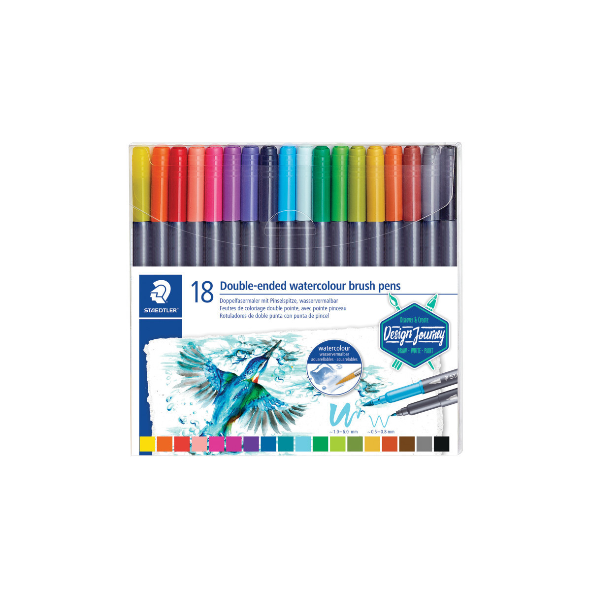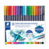 The Staedtler double ended watercolor markers offer a wide range of creative possibilities when mixed with water. One end has a fine tip for detail work, and the other is a brush tip for contouring, shading, or calligraphy. Durable foam brush tip will not tear or fray. Includes 18 assorted markers.