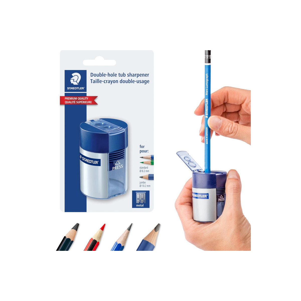 This STAEDTLER dual hole manual handheld pencil sharpener features two precision holes for standard and oversized pencils, offering two sharpening angles—23° for clear, accurate lines and 30° for broad, soft strokes. Its compact design features a secure shavings container with a push-button lock to prevent spills, along with a hinged blade cover for safe operation and easy maintenance, making it perfect for quick and convenient sharpening anywhere.