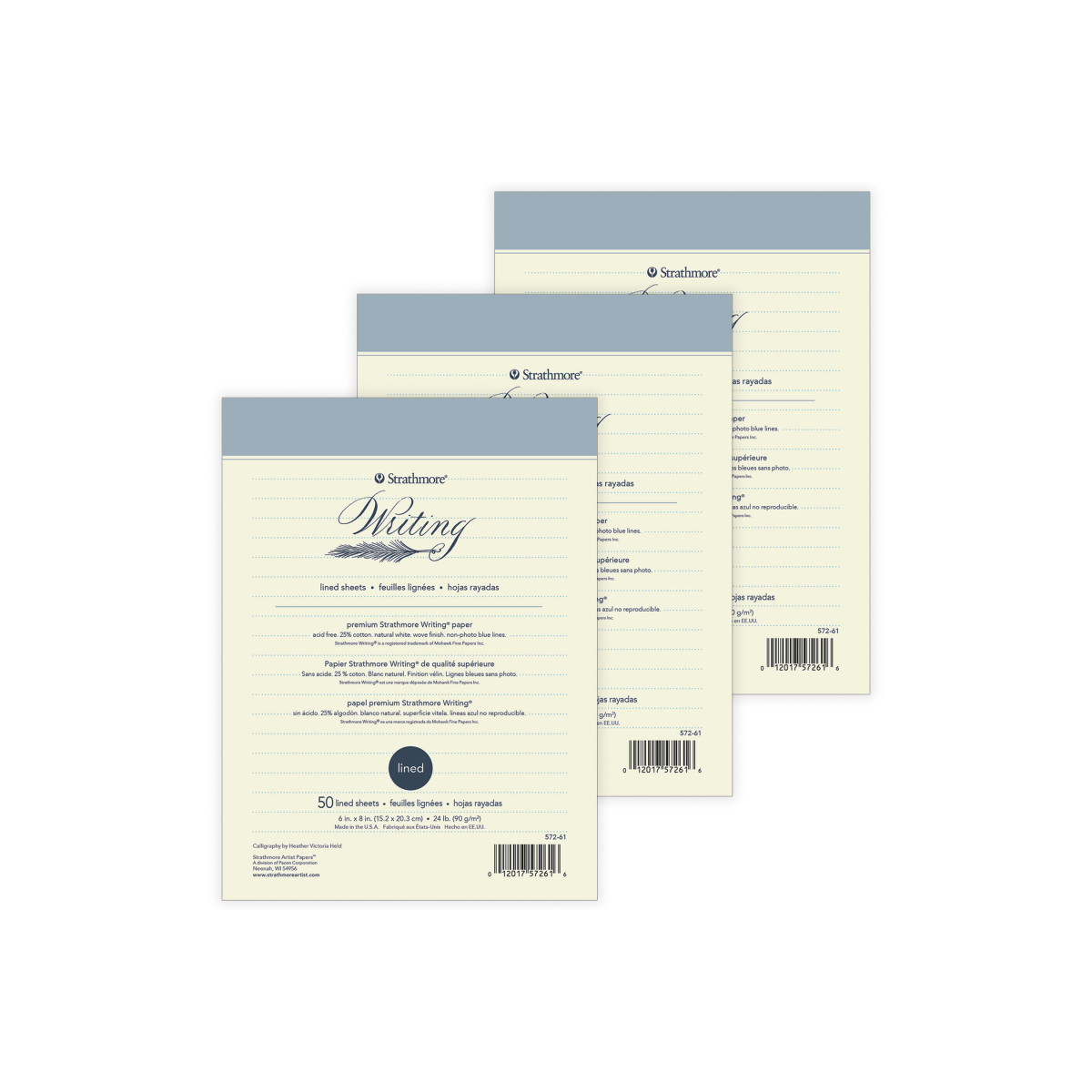 Introducing Strathmore 500 Series Lined Writing Paper--the perfect writing companion for calligraphers, hand lettering hobbyists, and anyone desiring to create artful correspondence. With a natural white, wove finish paper that is both acid free and non-photo blue lined, let your writing command the page in an organized fashion. The 25% cotton paper is ideal for a broad range of ink and pencil writing instruments. Pads feature a flip-over cover that for an easy, clean sheet removal without the risk of tears or creases. Our 500 Series sets the standard for excellence within the fine art industry, featuring superior-grade surfaces crafted with 100% cotton fibers for unmatched durability, carefully crafted textures & archival, acid-free composition. Endorsed by professional artists as the surface of choice for art pieces showcased in galleries, sold at auctions or submitted to the most prestigious competitions. Sold as a pack of 3.