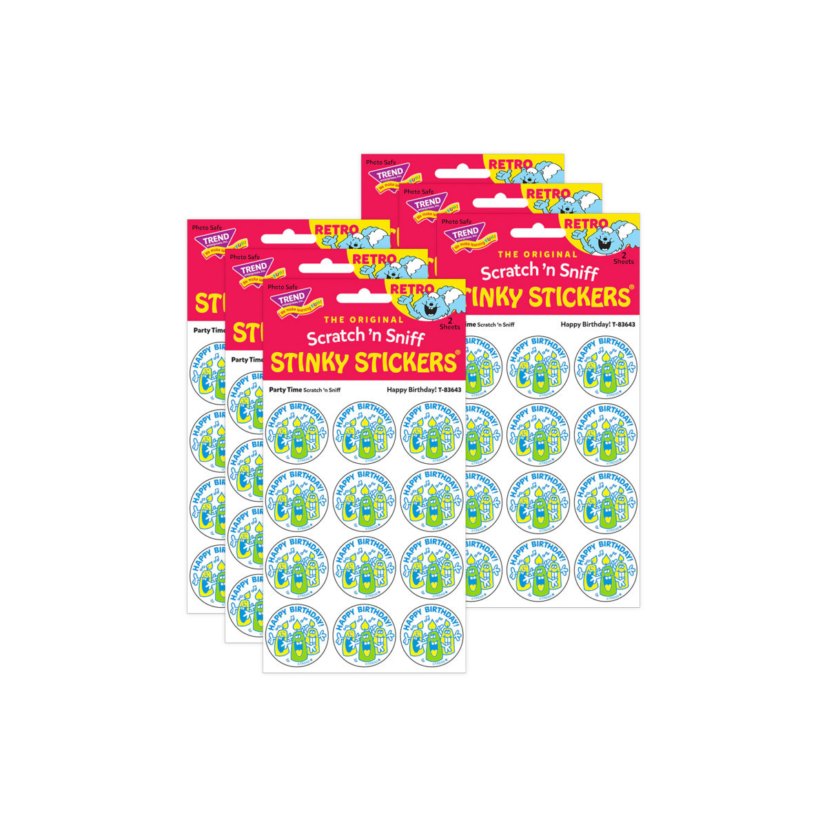 Get a whiff of this Happy Birthday!, party time-scented sticker! TREND Scratch n Sniff Stinky Stickers from the '80s are BACK! Fun to collect, trade, and celebrate accomplishments and special occasions. Collectors will be happy to spot the star symbol to distinguish TREND Retro Stinky Stickers from those printed in the 1980s. Each pack includes 2 sheets / 24 stickers, measuring 1-1/4" diameter. Ages 3 and up. Made in the USA. Sold as 6 packs.