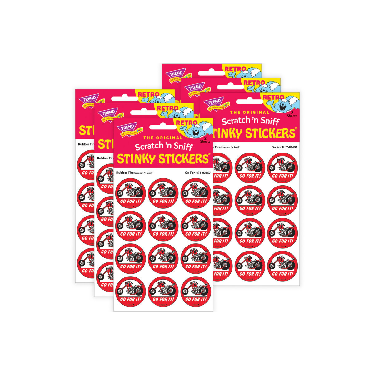 Get a whiff of this Go For It, rubber tire-scented motorcycle sticker! TREND Scratch n Sniff Stinky Stickers from the '80s are BACK! Fun to collect, trade, and celebrate accomplishments and special occasions. Collectors will be happy to spot the star symbol to distinguish TREND Retro Stinky Stickers from those printed in the 1980s. Sold as 6 packs.