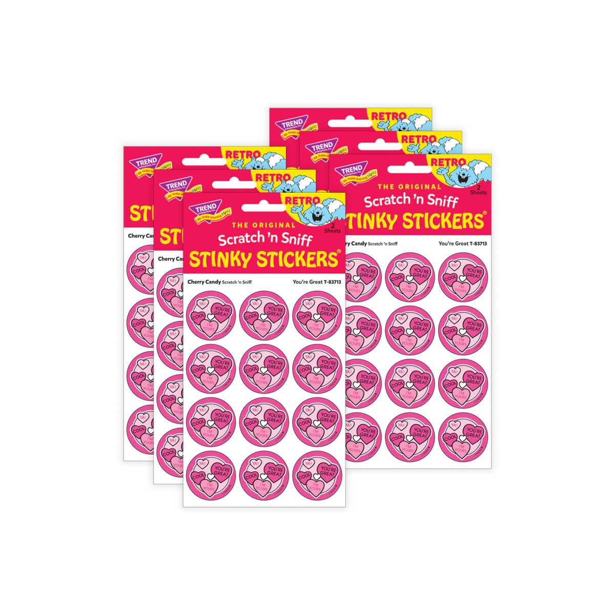 Get a whiff of this You're Great, Cherry Candy-scented sticker! TREND Scratch n Sniff Stinky Stickers from the 80s are BACK! Fun to collect, trade, and celebrate accomplishments and special occasions. Collectors will be happy to spot the star symbol to distinguish TREND Retro Stinky Stickers from those printed in the 1980s. Sold as 6 packs.