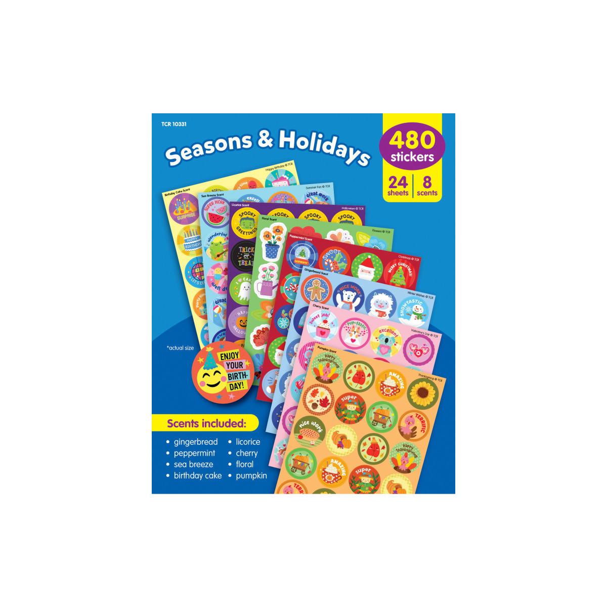 INCLUDES 480 SMELLY STICKERS: Motivate students to stay engaged in class and at home with these scented stickers. Pack includes 480 total stickers in 8 scents: gingerbread, peppermint, sea breeze, birthday cake, licorice, cherry, floral, and pumpkin. Sticker measurements vary from about 2-1/4" to 5/8".