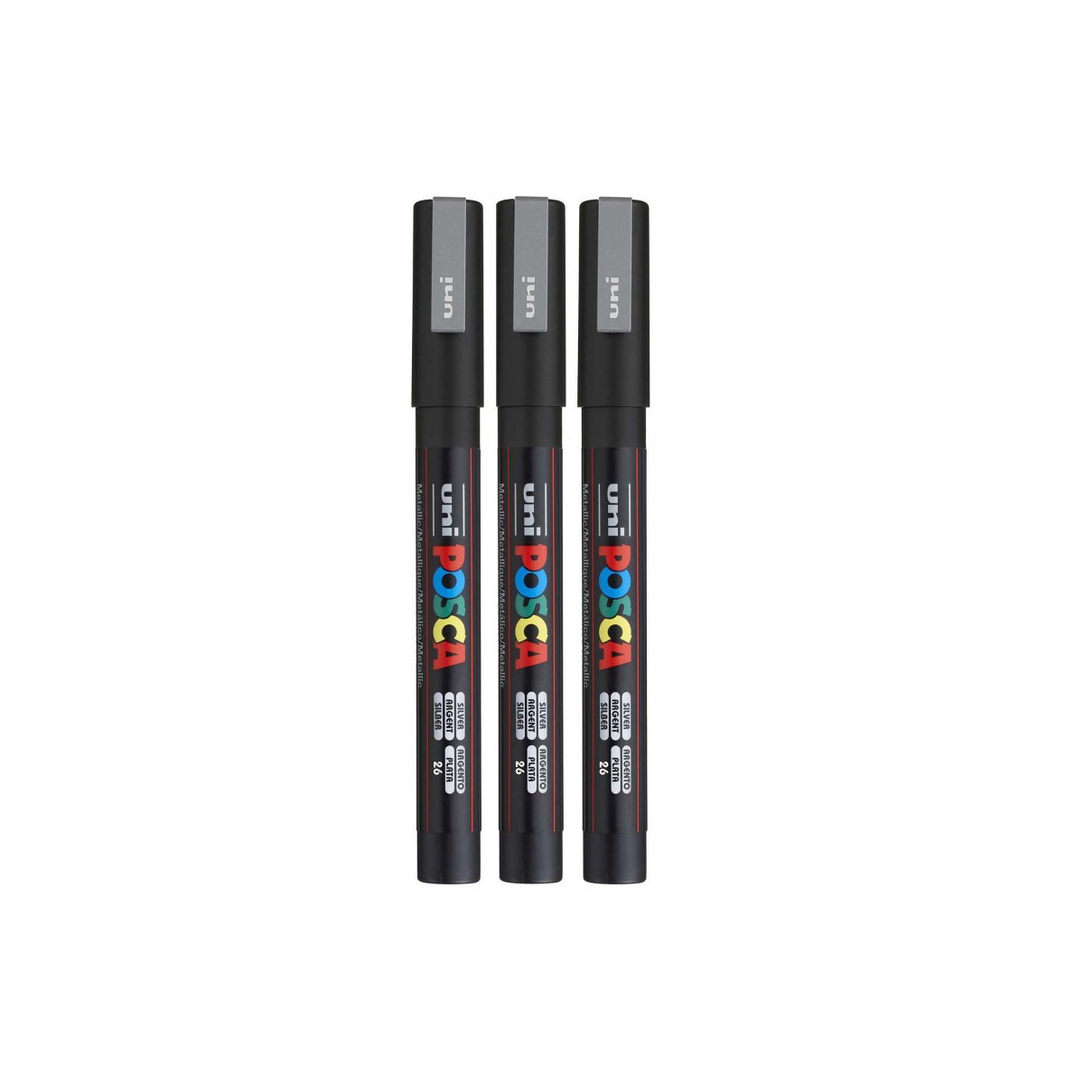 Achieve smooth, precise lines with the POSCA PC-3M Paint Marker, Fine Bullet Tip (0.9–1.3 mm), Silver. This versatile marker size is perfect for controlled outlining, drawing, lettering, coloring, and detailed embellishment across a wide range of creative projects. The water-based, opaque paint delivers vivid, metallic silver coverage on paper, canvas, wood, plastic, metal, glass, ceramic, stone, and fabric, making it one of the most popular multi-surface markers used by students, artists, and makers. The fine bullet tip provides consistent, clean strokes with excellent control, ideal for both small-scale artwork and refined mixed-media work. Colors dry quickly, layer smoothly, and resist smudging or bleed-through. With a valve-controlled ink system for even paint flow and highly pigmented paint that remains vibrant over time, POSCA PC-3M markers are the go-to choice for detail-rich creative expression on any surface. Sold as a pack of 3.