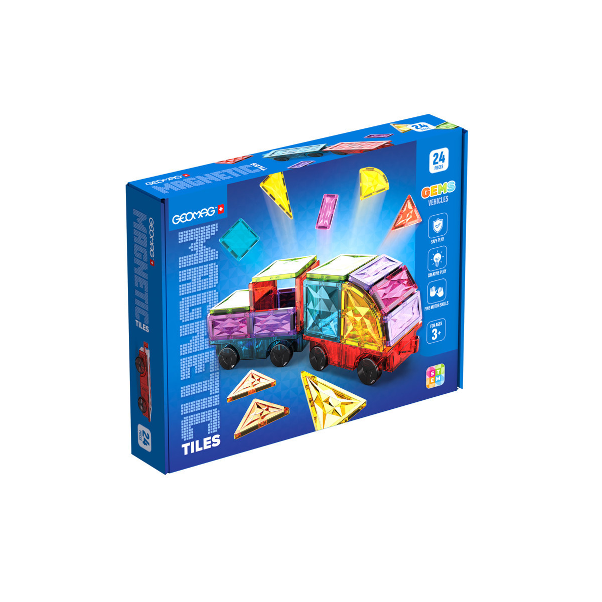 Click together colorful, translucent tiles with Magnetic Tiles Gems Vehicles 24. Children build flat mosaics and 3D structures as magnets along the tile edges snap together, supporting spatial reasoning, creativity and early engineering skills.