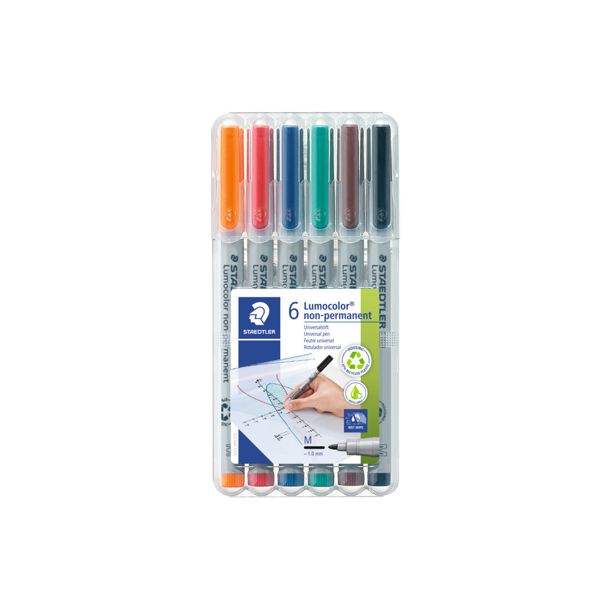 Smooth, effortless and even. Staedtler's line of Lumocolor marker pens come in medium line width (1.0 mm) and six colors for hours of creativity, or long, hard use in the office. And they are eco-friendly, made from 97% recycled plastic and come in a reusable plastic easel storage case! When the pros need durability and precision, they turn to Staedtler. Whether it's scientific or creative endeavors, in the home, office or classroom, Staedtler helps bring ideas to life.