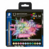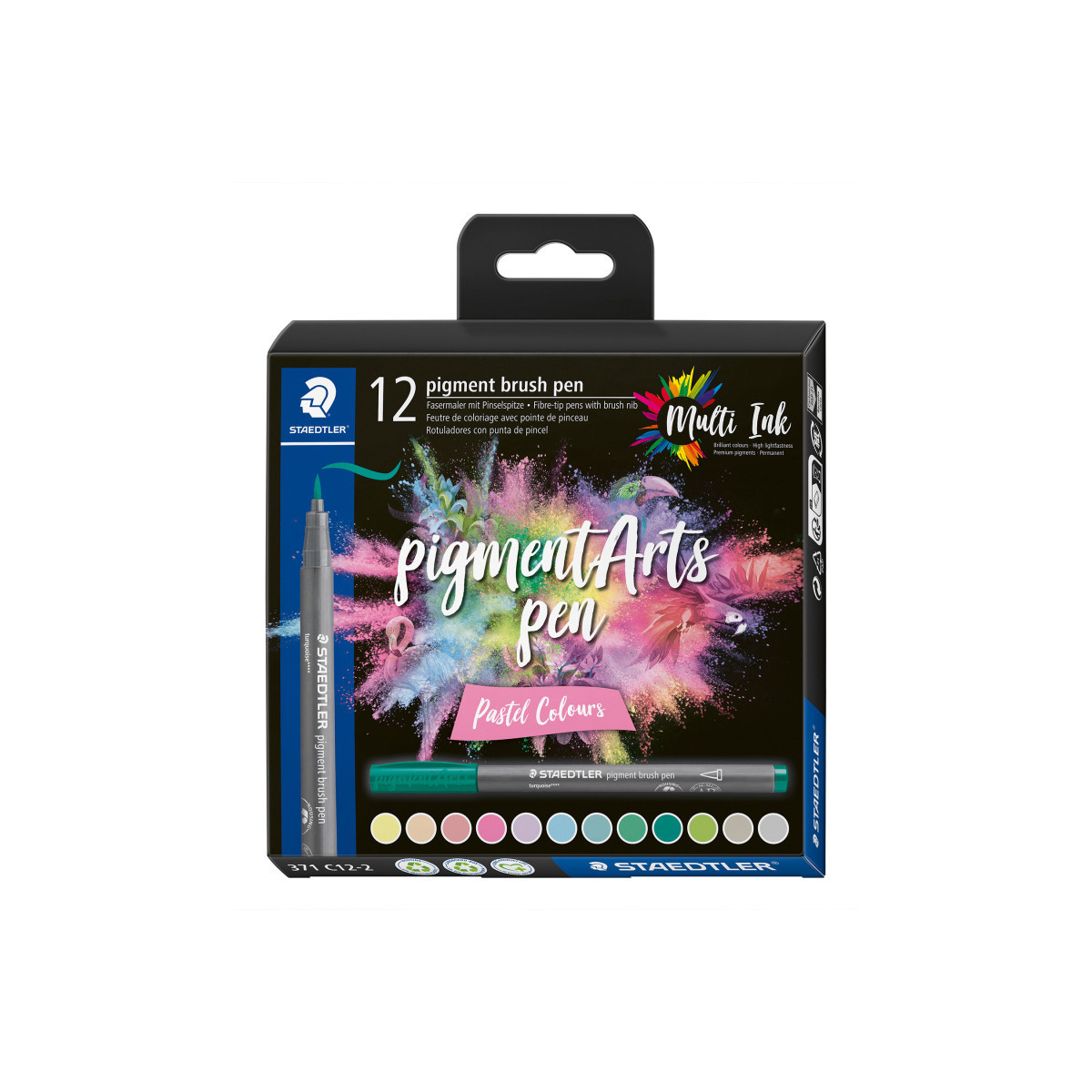Immerse yourself in a world of brilliant and vibrant colors! This Staedtler Pigment Arts Pen Set features New Multi Ink technology with premium pigments which means that you can achieve extreme lightfastness and exceptional color brilliance on a wide range of surfaces even after years of UV exposure. It is ideal for brush lettering, drawings, illustrations, or coloring. Transform your art into vivid and long-lasting masterpieces. Get Multi creative! This set of 12 pastel colors allows you a wide range of creative choices!