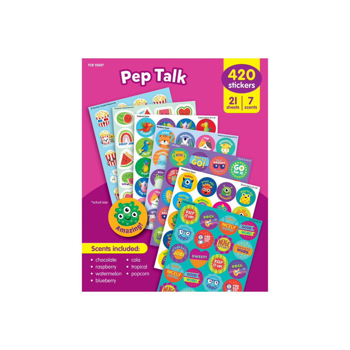 INCLUDES 420 SMELLY STICKERS: Motivate students to bring their A game to every assignment with these smelly stickers. Pack includes 420 total stickers in 7 scents: chocolate, raspberry, watermelon, blueberry, cola, tropical, and popcorn. Sticker measurements vary from about 2-1/4" to 5/8".