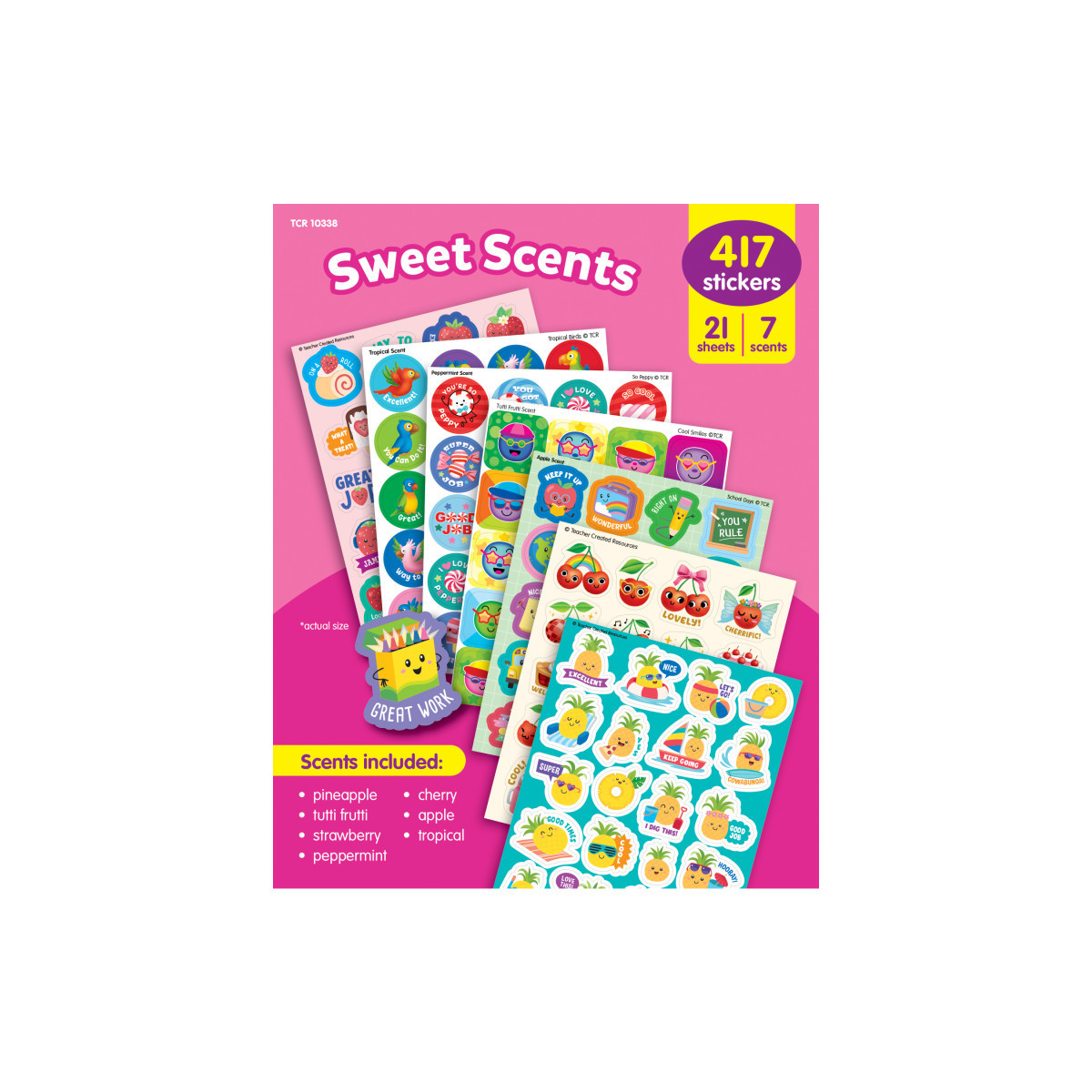 INCLUDES 417 SMELLY STICKERS: Sweeten up any learning space with these fragrant stickers. Pack includes 417 total stickers in 7 scents: pineapple, tutti frutti, strawberry, peppermint, cherry, apple, and tropical. Sticker measurements vary from about 2-1/4" to 5/8".
