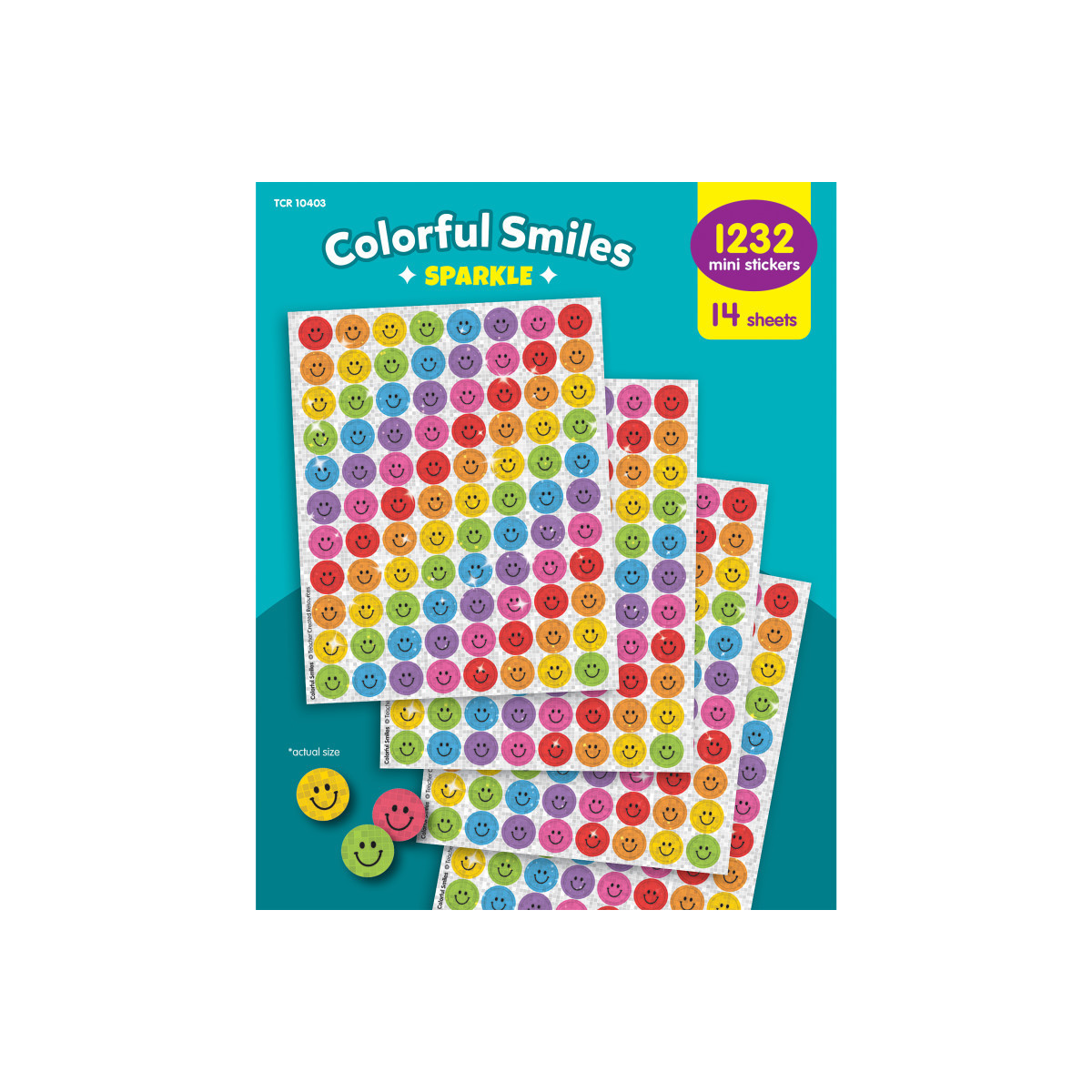 - INCLUDES 1,232 SPARKLY STICKERS: Bring a touch of glam to student incentives with these stickers! Each pack includes a smiley face in 8 sparkly colors. Each sticker measures about 7/16" in diameter.