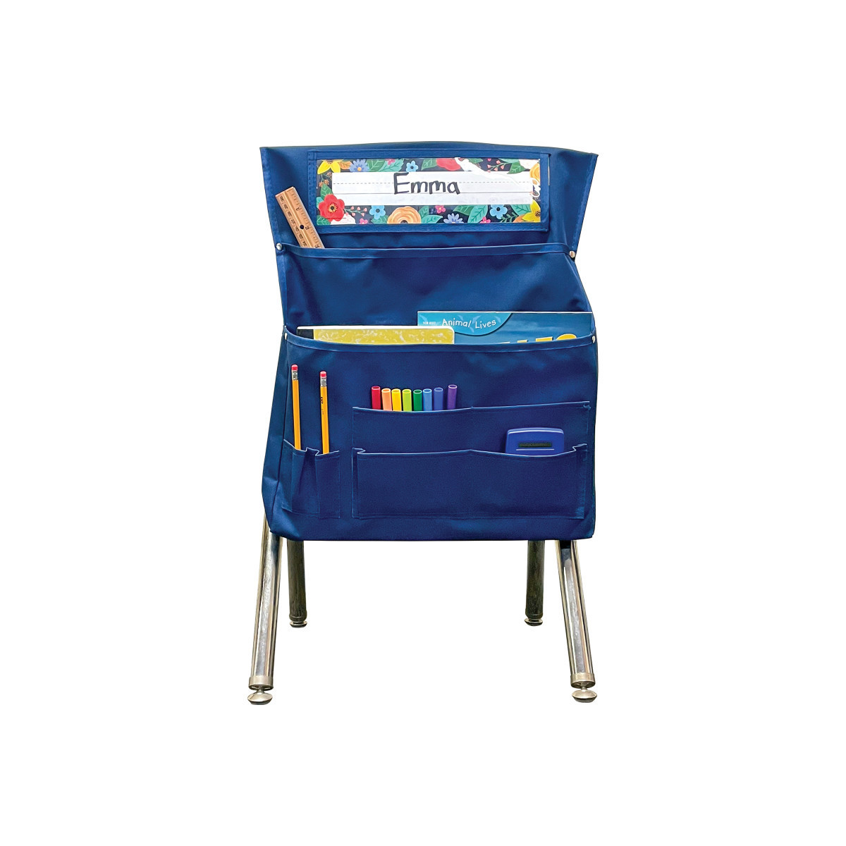 IDEAL FOR CLASSROOMS & LEARNING SPACES: Bring a stylish touch to classroom organization with this chair pocket. Redesigned with reinforced stitching and durable fabric, and featuring a deep navy color, this storage solution elevates the look of any classroom. With eight pockets, there is plenty of room to organize every student’s school essentials. The two larger storage areas are great for workbooks and folders, while the six smaller pockets are ideal for supplies.
